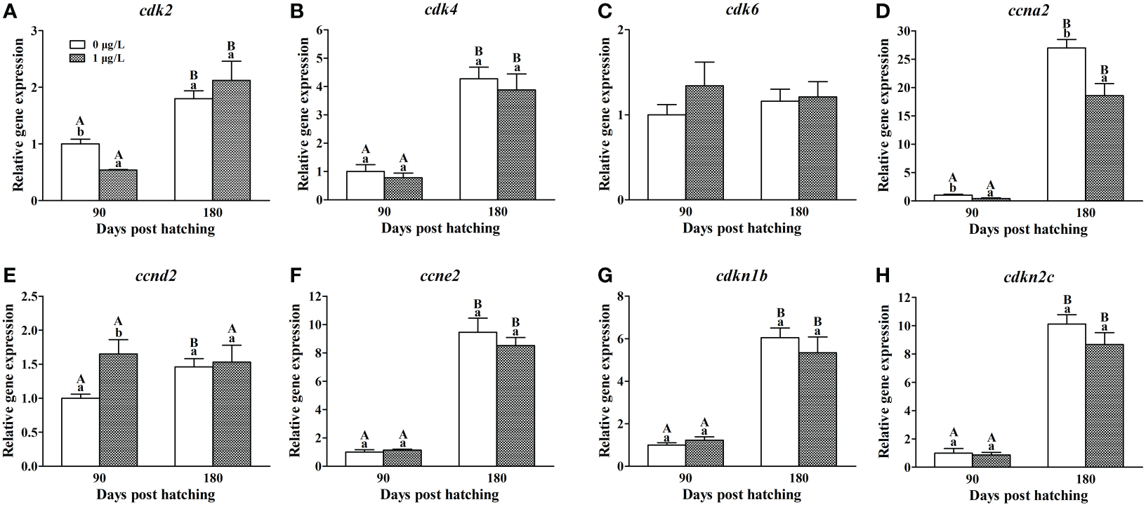 Effects of E2 on the mRNA levels of cdk2 (A), cdk4(B), cdk6(C), ccna2(D), ccnd2(E), ccne2(F), cdkn1b(G) and cdkn2c(H) involving in cell cycle. Values represent mean ± SEM (n = 4). Uppercase letters indicate significant differences over time within the same group (P < 0.05). Lowercase letters indicate significant differences between groups within the same time (P < 0.05).