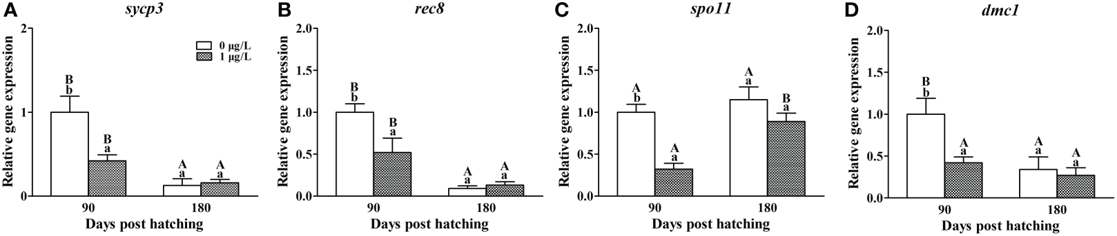 In the ovaries of control females, decreased mRNA levels of sycp3 (F = 1.198, P = 0.008), rec8 (F = 0.846, P = 0.013) and dmc1 (F = 1.228, P = 0.006) and unaltered mRNA levels of spo11 were observed at 180 dph compared with the values at 90 dph (Figure 4). E2 treatment resulted in a significant decrease in the mRNA levels of the four genes at 90 dph. While no significant difference was observed in the mRNA levels of all the four genes between E2-treated and control females at 180 dph.