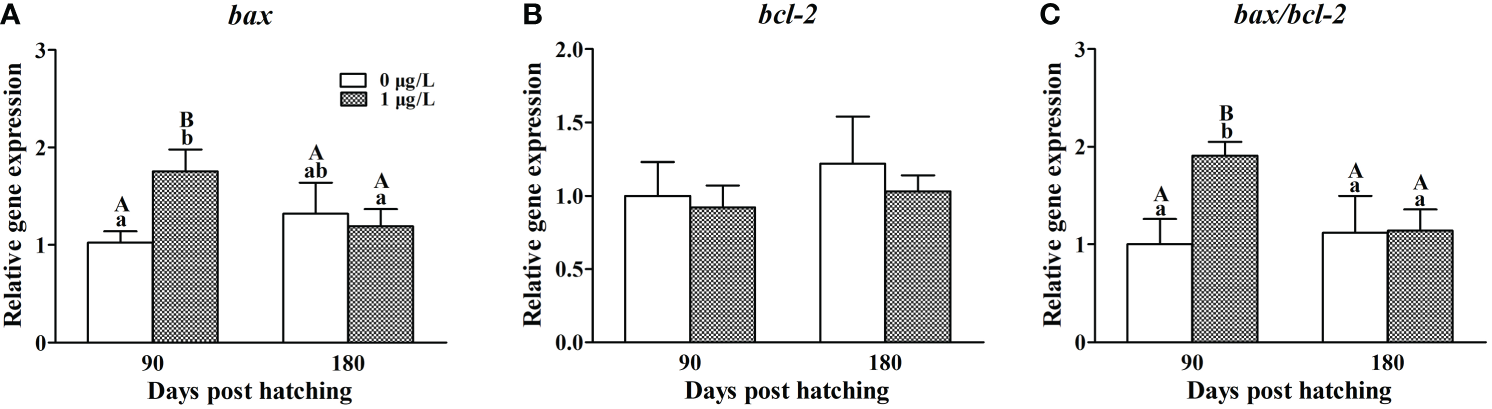 As for apoptosis genes, E2 treatment did not affect the mRNA levels of bax (Figure 5A), but significantly decreased the mRNA levels of bcl-2 (F = 2.463, P = 0.018) at 90 dph, when compared with the controls (Figure 5B). Correspondingly, the ratio of bax/bcl-2 (F = 0.837, P = 0.005) was significantly higher in the ovaries of E2-exposed females than the control values at 90 dph (Figure 5C). At 180 dph, no significant difference was observed in the expression of bax, bcl-2 and bax/bcl-2 ratio between E2-treated and control females.