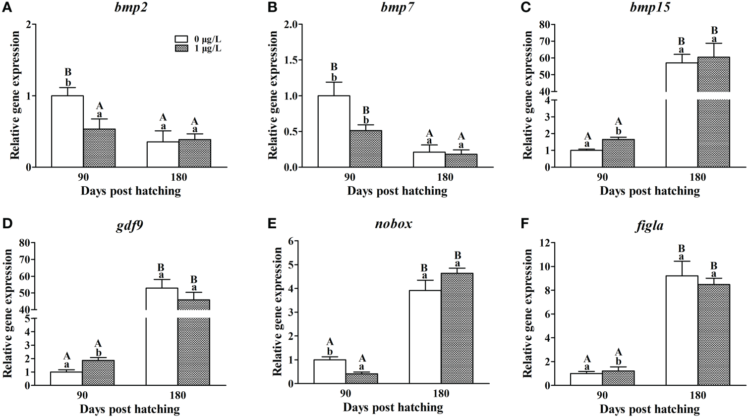 Effects of E2 on the mRNA levels of bmp2 (A), bmp7(B), bmp15(C), gdf9(D), nobox(E) and figla(F) involving in follicle formation. Values represent mean ± SEM (n = 4). Uppercase letters indicate significant differences over time within the same group (P < 0.05). Lowercase letters indicate significant differences between groups within the same time (P < 0.05).