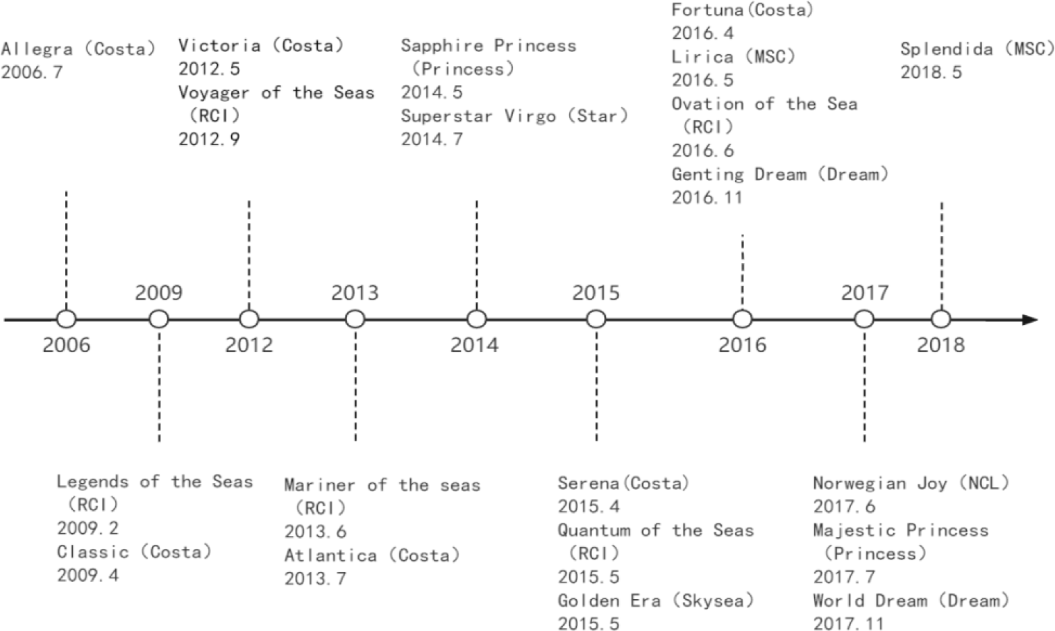 The timeline of cruise companies and ships operating in China.