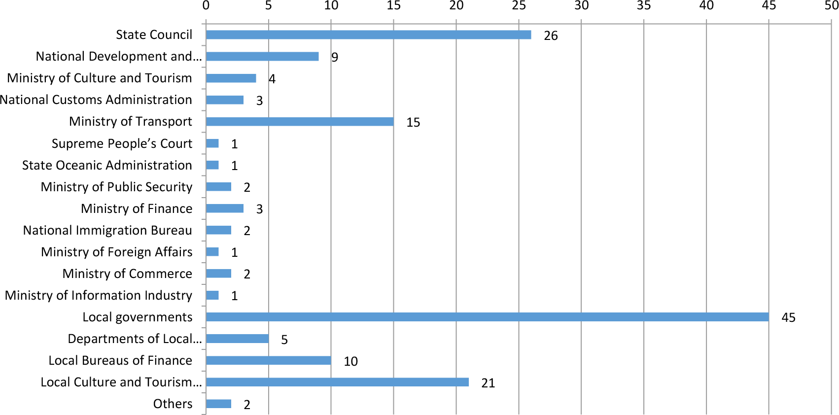 First, there is a large number of policies, at both the national and the local levels, among which 70 documents were from national agencies and 83 from local agencies (the total documents outnumber the policies because some policies are jointly released by multiple departments). Figure 5 shows that at the national level, The State Council, the highest administrative authority in China, is the major policy-issuing body (up to 26) and at the local level, the local authorities are the principal issuing entities (up to 45). This strongly indicates that the national and local government agencies attach great importance to the cruise industry.