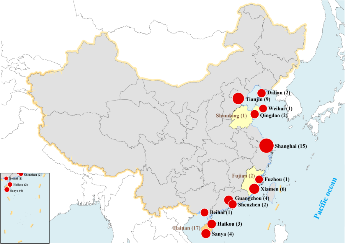 Third, local policies are mostly issued by cities and regions where cruise ports are located (Figure 6), such as Shanghai, Tianjin and Hainan. There is no doubt that these local policies are beneficial to the development of cruise ports and tourism in these cities. Is it the case that there are more cruise lines where more policies are made? Which is more obvious, local policies or national ones? A correlation analysis will be conducted later to address these issues.