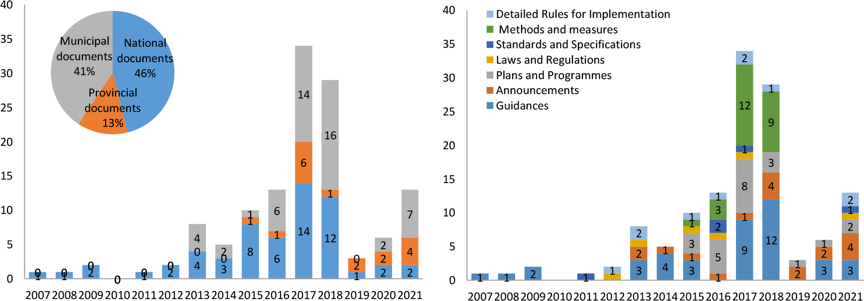 Types of released policies. Note: The figure on the left shows statistics of policies issued by administrative bodies at different levels; The figure on the right shows the statistics of the number of different policy types.