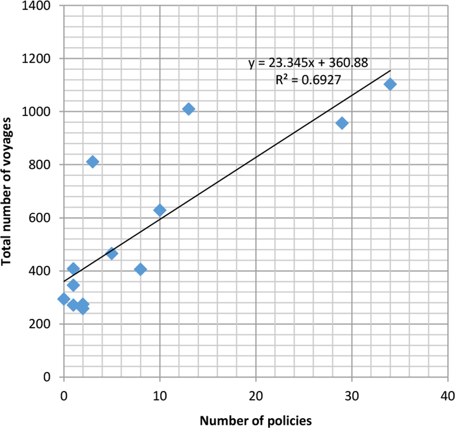 Linear relationship between cruise policies and total voyages.