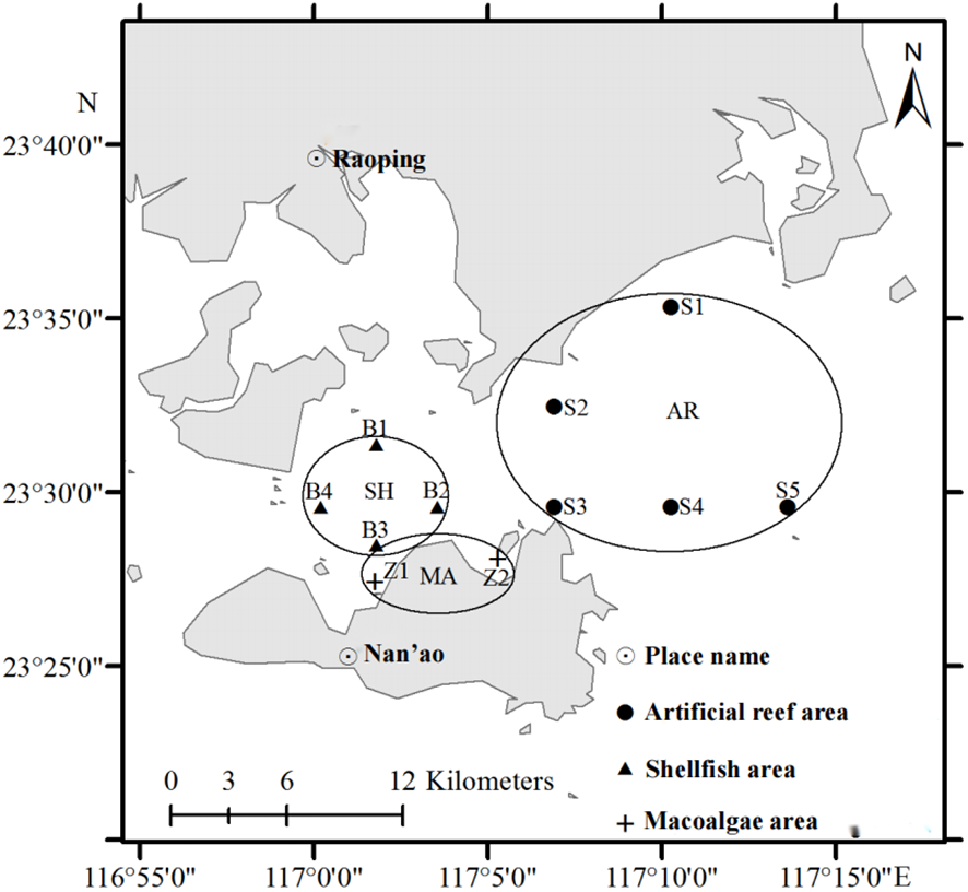 The study area is located in the coastal site of the Zhelin Bay, Guangdong Province, China (116°55′E–117°14′E, 23°27′N–23°35′N, Figure 1). The Zhelin Bay is characterized by a subtropical climate with an annual average temperature of 21°C. Three functional areas were investigated, the artificial reef area (AR), shellfish area (SH), and macroalgae area (MA). Special artificial reef structures were dropped in the artificial reef area to attract organisms to settle and breed. In the shellfish area, cage rearing and cone rearing are carried out, and high-quality shellfish seedlings are cultivated for bottom-seeding multiplication. The macroalgae area was created by raising macroalgae on the sea bed and on rafts to repair the environment and improve marine primary productivity.