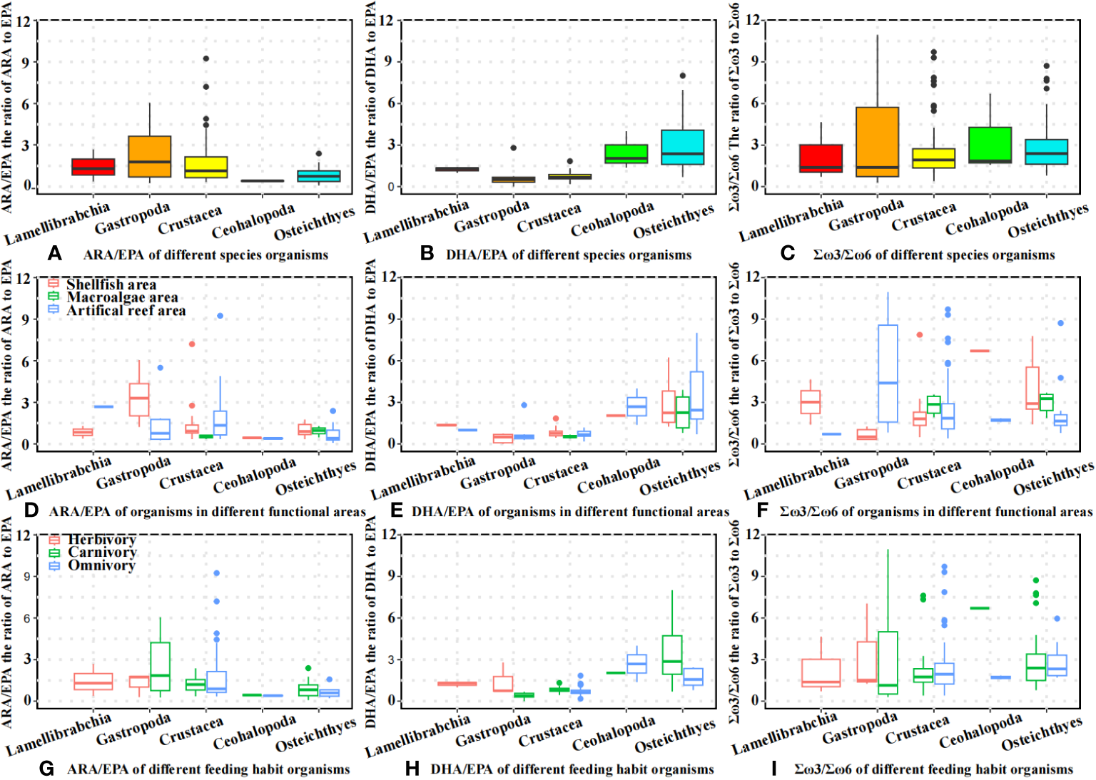 Fatty acid ratio of different organisms. (A) ARA/EPA of different species organisms; (B) DHA/EPA of different species organisms; (C) Σω3/Σω6 of different species organisms; (D) ARA/EPA of organisms in different functional areas; (E) DHA/EPA of organisms in different functional areas; (F) Σω3/Σω6 of organisms in different functional areas; (G) ARA/EPA of different feeding habit organisms; (H) DHA/EPA of different feeding habit organisms; (I) Σω3/Σω6 of different feeding habit organisms.