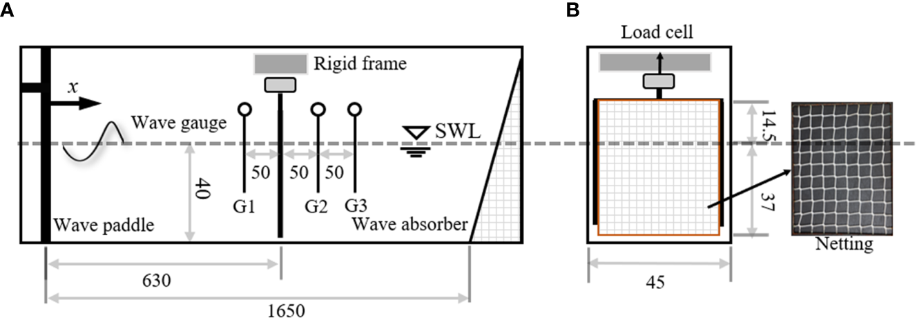 For some aquaculture facilities, the netting must be exceeded the still water level. Hydrodynamics would be more dominated by waves than flows. Balash et al. (2009) measured the hydrodynamic forces on netting in waves that can be assumed as linear wave theory, and also simulated the forces with a proposed numerical model. They found that the drag and added mass coefficients were not well quantified by conventional nondimensional parameters (such as Keulegan-Carpenter and Reynolds numbers). Wang et al. (2022) investigated the hydrodynamic and deformation of a prototype pile-net configuration based on the lumped mass model, they found the force was mainly from the top half of the netting. Through the analysis of the above related researches, there would be a lack of in-depth research on the force and force prediction of netting under waves, especially strong nonlinear waves.