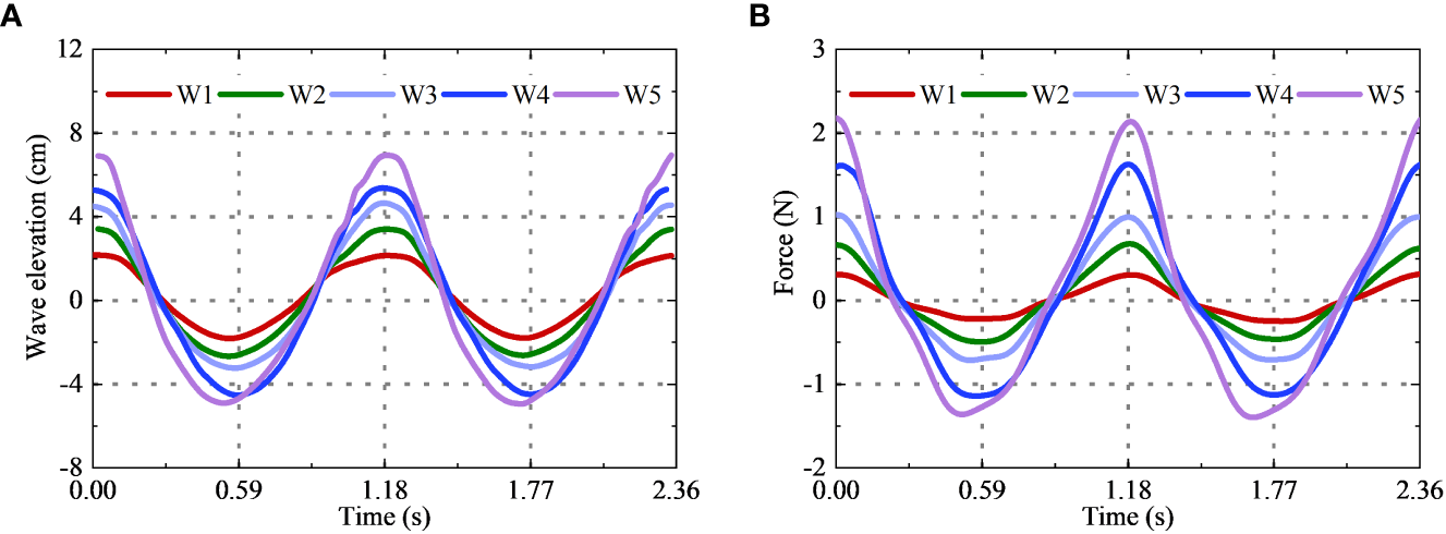 The wave forces on the structure were directly caused by the directional propagation of water waves. To intuitively analyze the relationship between wave surface and wave force on netting, they were placed in a figure together. The wave surface curve at the target position were shown in Figure 4A, and the wave force curve of netting at the same position were shown in Figure 4B. The wave surface and force curves included all five wave conditions as shown in Table 1. The curves showed the data of two consecutive wave periods that start from the peak value.