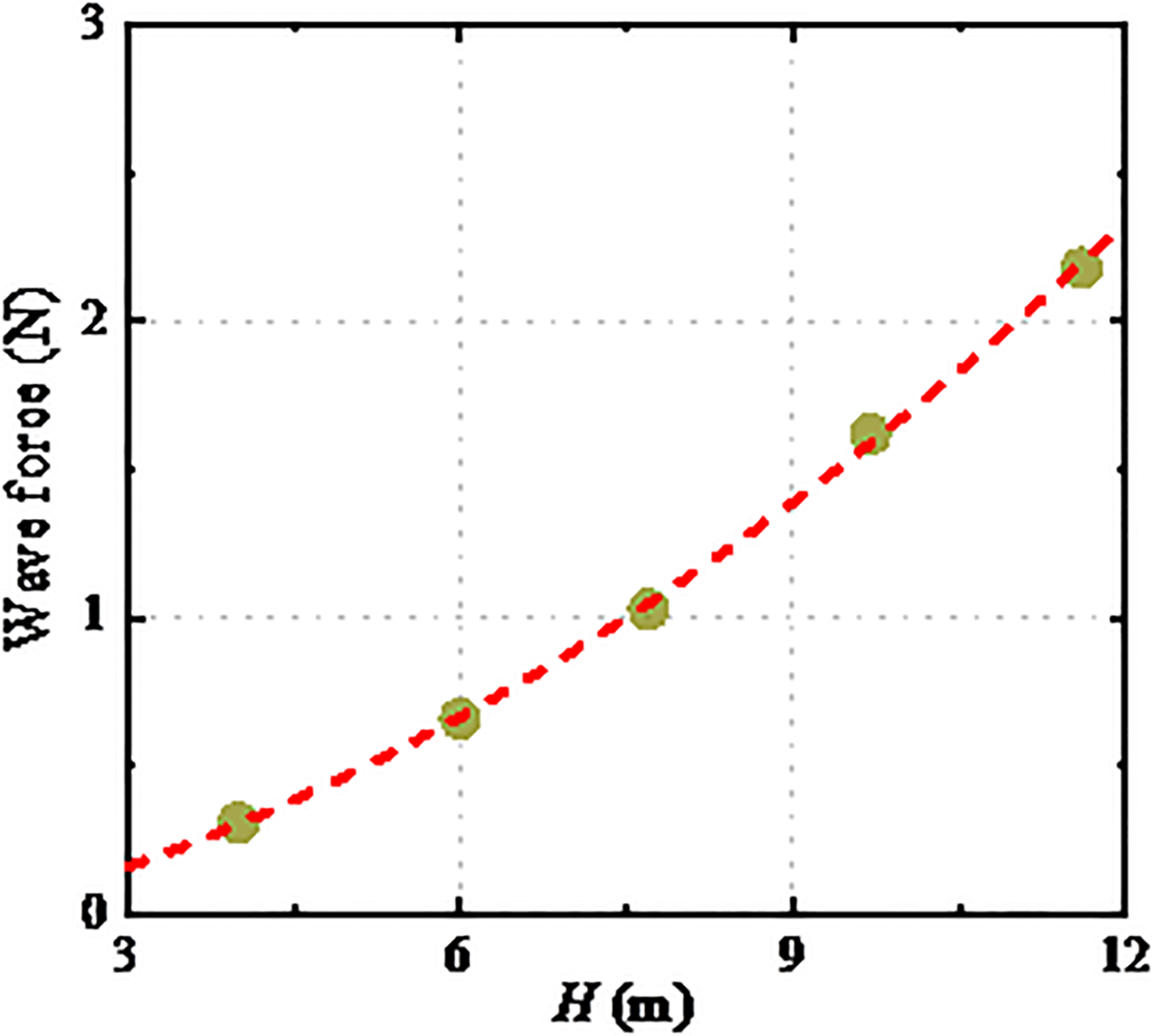 The peak value of wave force and the corresponding wave height were taken as two-dimensional scattered data, and the change rule was shown in the figure. The limited scattered point data in Figure 5 can basically depict the function type of the relationship between wave force and wave height. Here, the scattered point data was fitted by using a quadratic polynomial, and the fitting curve was shown by the red dashed line in Figure 5. The fitting curve and scatter point data basically coincided, which was consistent with the assumption of Morison equation in Equation 3 because of the drag force played a leading role in wave force of the netting.