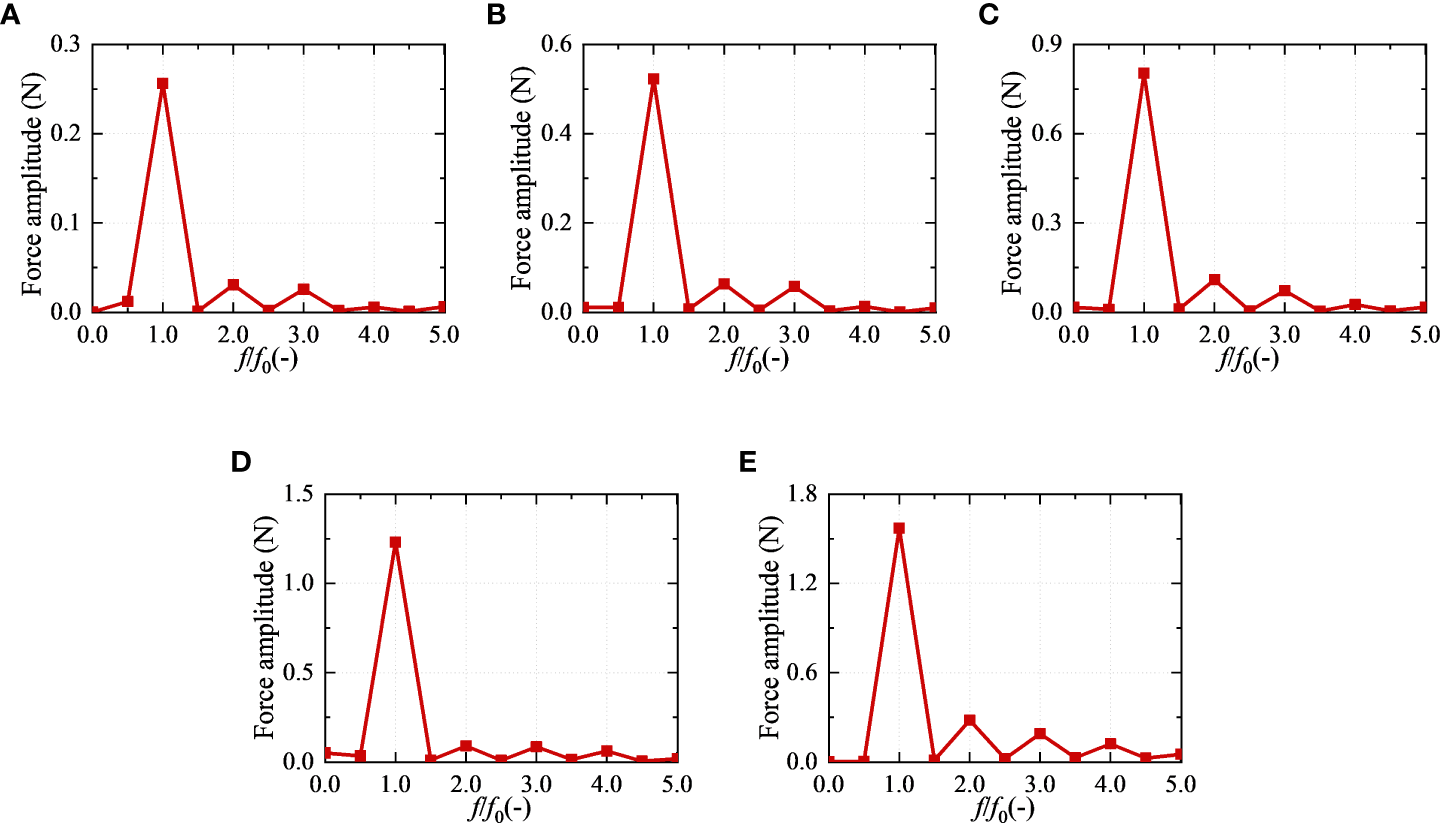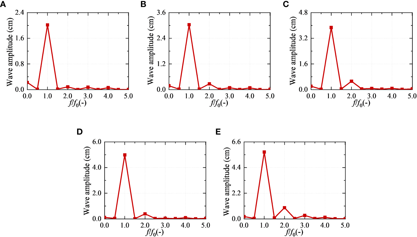The amplitude spectrum of wave force in the experiment. (A) W1, ϵ = 0.021; (B) W2, ϵ = 0.032; (C) W3, ϵ = 0.041; (D) W4, ϵ = 0.052; (E) W5, ϵ = 0.061.