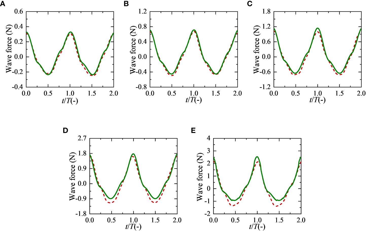 Comparison of the predicted wave force and the test force of netting in time domain. The green solid lines represent the predicted wave force and the red dashed lines represent the test force. (A) W1, ϵ = 0.021; (B) W2, ϵ = 0.032; (C) W3, ϵ = 0.041; (D) W4, ϵ = 0.052; (E) W5, ϵ = 0.061.
