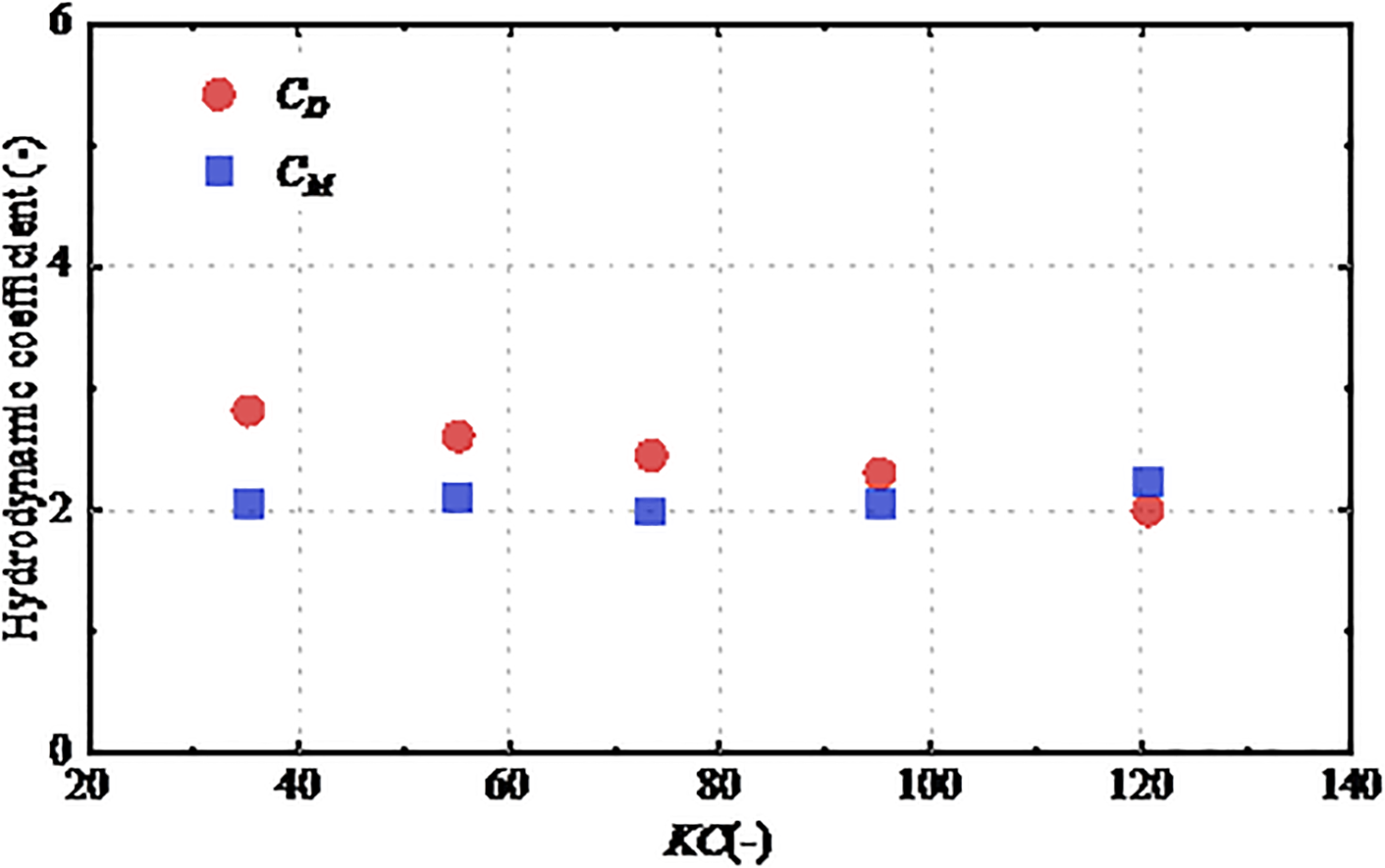 It can be seen from the figure that CD decreased with the increasing KC number, while CM remained basically unchanged. The variation range of CD value was 2-2.82, with an average value of 2.4. The variation range of CM was 1.99-2.23, with an average value of 2.1. Considering that the effective cross-section of the twine was nearly rectangular, its CD value will be significantly greater than the empirical CD value of slender rods with cylindrical section. In addition, due to the problems of the netting knitting process, its surface roughness was large, which would also increase its drag coefficient. Therefore, the value range of drag coefficient obtained in this study had important practical significance and can provide reference for the design of anti-wave cage.
