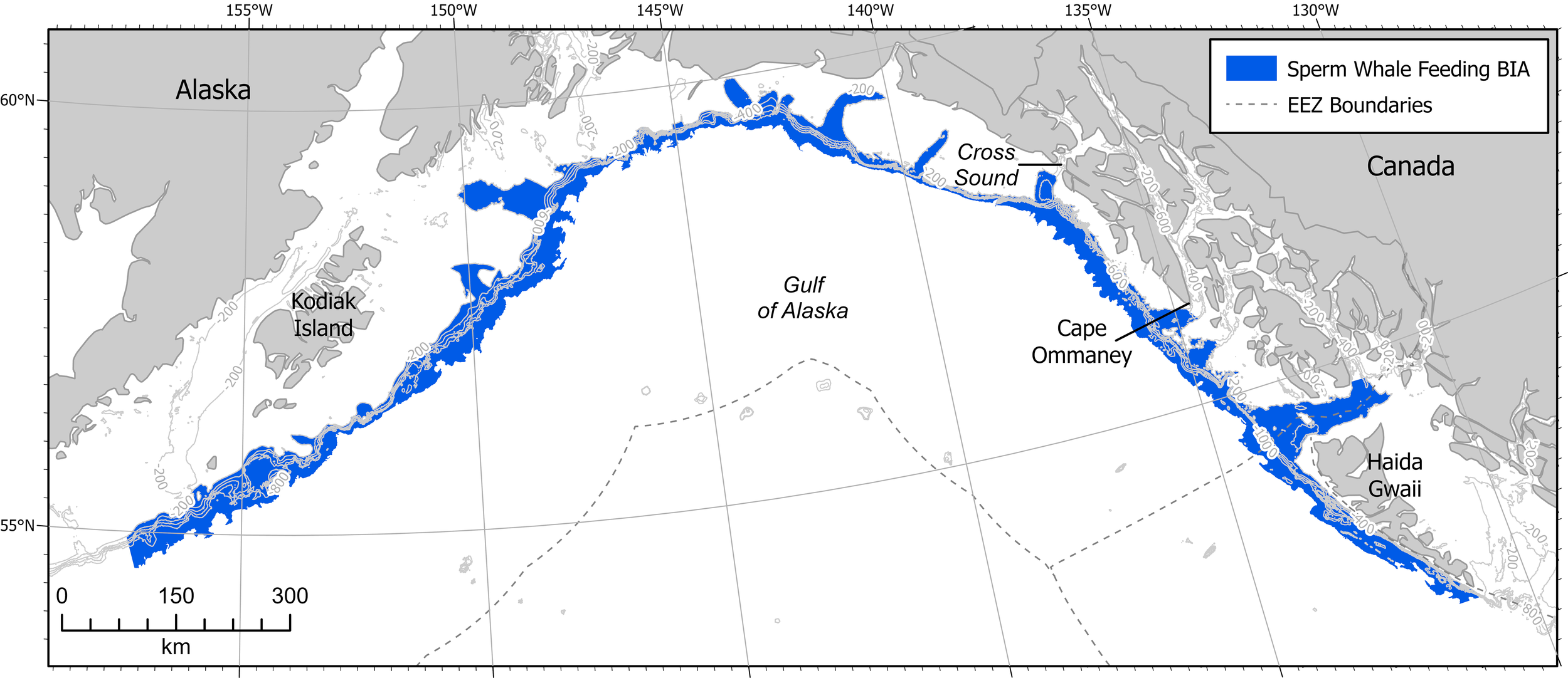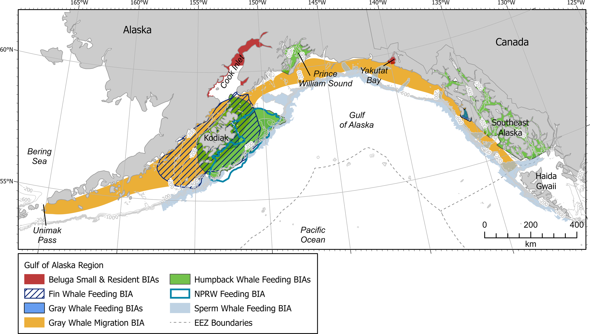 Gulf of Alaska map showing all BIAs. Contour lines shown at 200, 400, 600, 800, and 1000 m depths where relevant. EEZ refers to the US Exclusive Economic Zone, defined as 200 nm from shore.