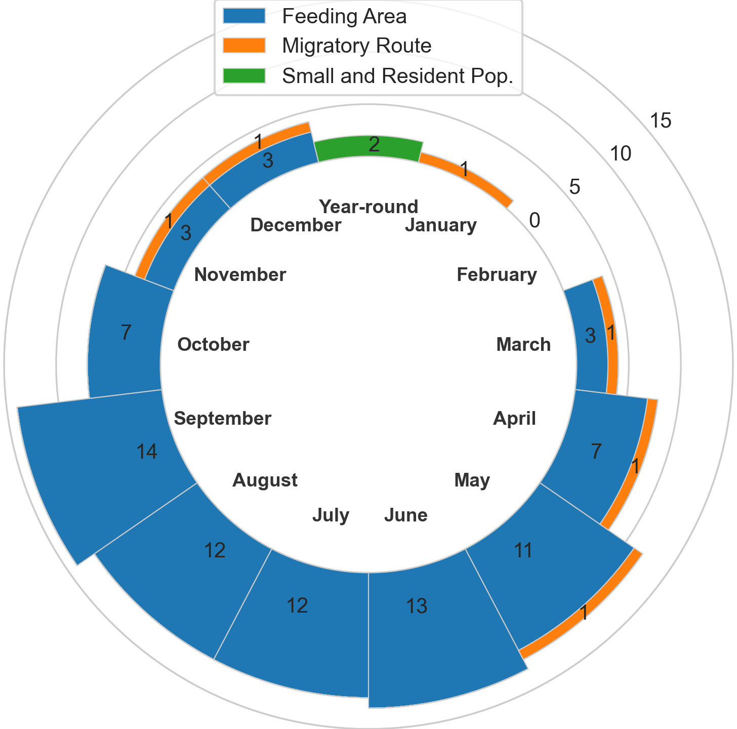 The BIA I project identified 14 BIAs (Ferguson et al., 2015), which were modified, split, and updated to result in the 20 BIAs for this assessment. One new species was added, with a sperm whale F-BIA (Supplemental description 4.25). The humpback whale BIA in the Shumagin Islands was removed and listed instead as a Watch List area (Supplemental description 4.23) due to lack of data support or any information that could be added since BIA I (Ferguson et al., 2015). Two BIAs were split into multiple BIAs: humpback whales in Southeast Alaska were split from one overall BIA with three seasonal occurrences to 10 BIAs (Supplemental descriptions 4.9 – 4.13, 4.15-4.18, 4.20) and two Watch List areas (Supplemental descriptions 4.21, 4.22) with their own temporal delineation (see example 4 below); and gray whales in Sitka Sound were split from one larger area into a summer feeding Watch List area in Shelikof Bay (Supplemental description 4.7) and a spring F-BIA focused on herring (see Example 2 below, and Supplemental description 4.5) (Tables 1, 2; Figure 1). For four BIAs (Cook Inlet and Yakutat belugas, as well as the gray whale migratory BIA and gray whale Kodiak Island F-BIA) the boundaries remained the same and supporting data only was updated (Supplemental descriptions 4.1-4.2, 4.8, and 4.4 respectively). For four BIAs, the boundaries were redrawn and supporting data were updated: fin whales and humpback whales near Kodiak Island (Supplemental descriptions 4.3, 4.19), humpback whales in Prince William Sound (Supplemental description 4.14), and North Pacific right whales (Supplemental description 4.24). Additionally, we added five Watch List areas not previously delineated (Table 2; Supplemental descriptions 4.6 and 4.21-4.23). In order to better evaluate these watch list areas, more time and effort are needed in the field.