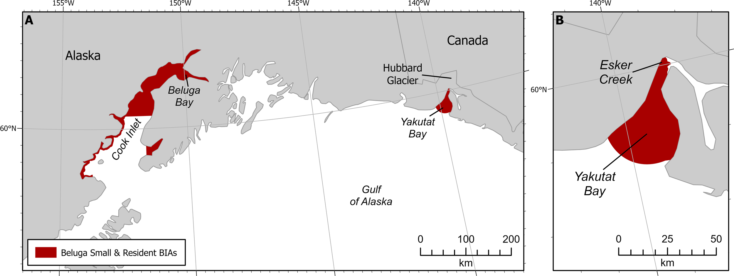 Beluga small and resident population BIAs. (A) Both GOA S-BIAs. (B) Yakutat S-BIA zoomed in.