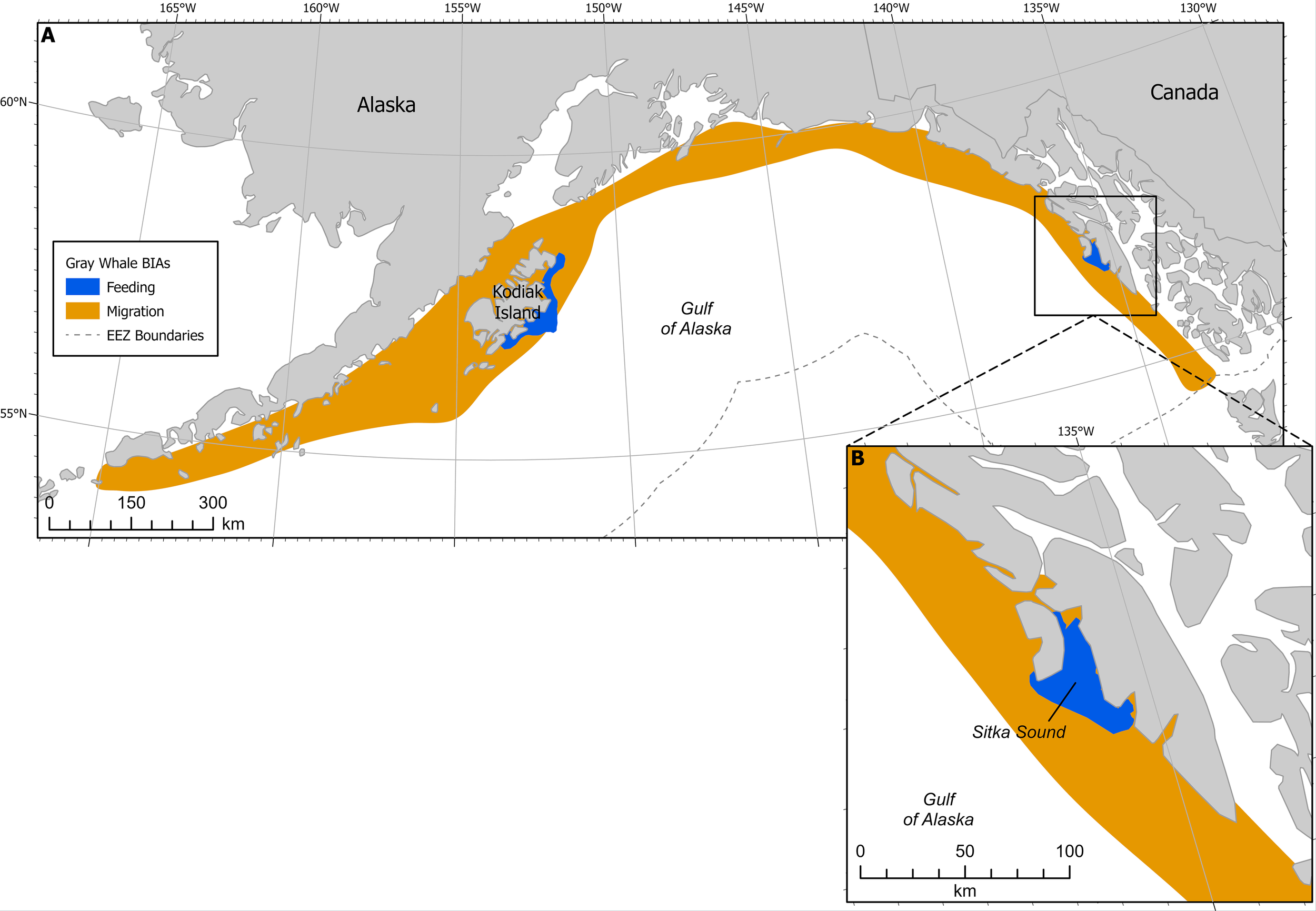 (A) Gray whale BIAs with migratory BIA (M-BIA) shown in orange. Inset (B) shows Sitka Sound F-BIA. EEZ refers to the US Exclusive Economic Zone, defined as 200 nm from shore.