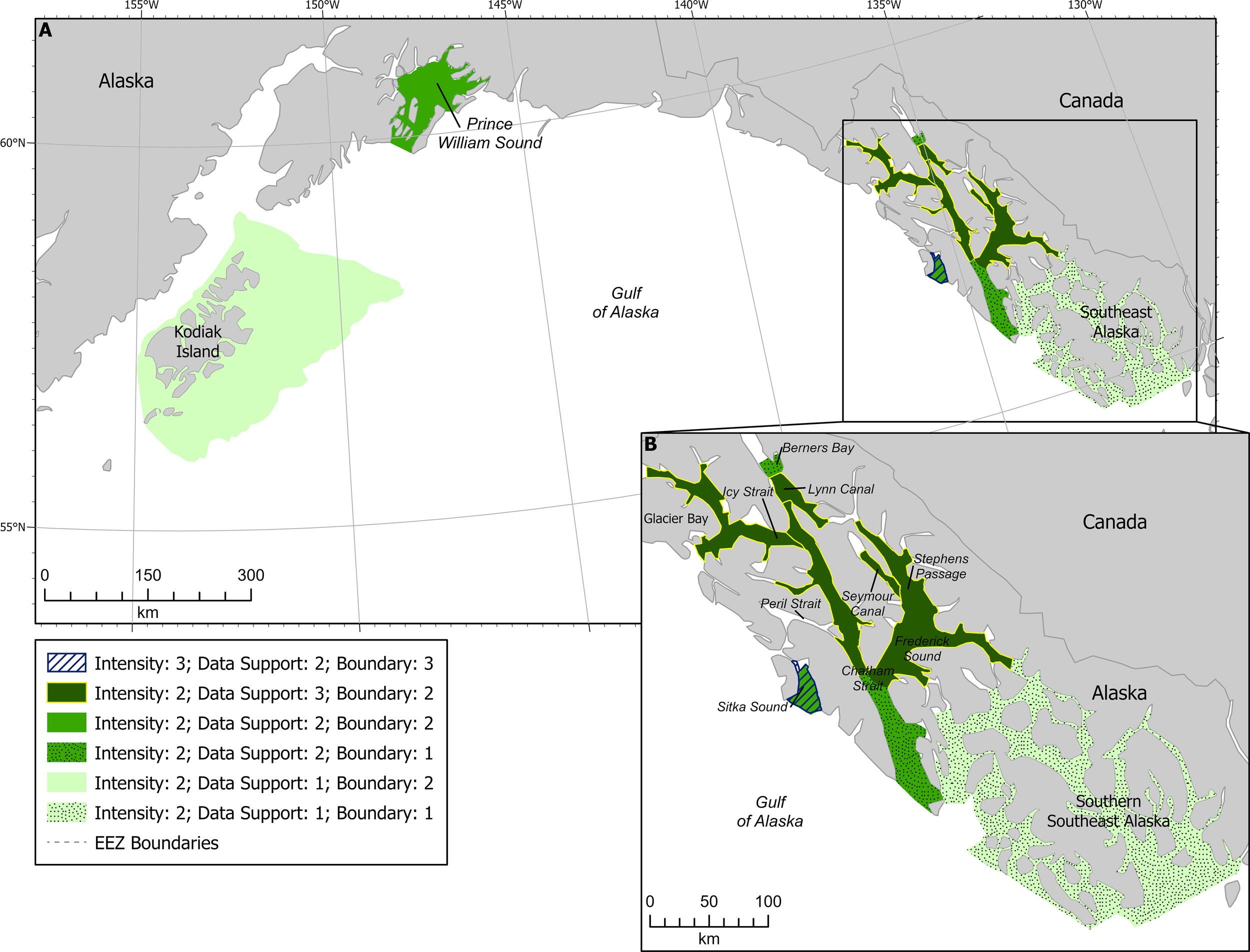 In the GOA, regional leads and SMEs used all available information to assess, delineate, and score candidate BIAs, including the older information sources documented in Ferguson et al. (2015), recent (2015-present) scientific publications, survey reports, technical memorandums, unpublished visual sighting data, line transect surveys, citizen science data, Indigenous knowledge, tagging data, acoustic recordings, and local knowledge from regional SMEs. Each candidate BIA was scored for Intensity, Data Support, Importance, Boundary Certainty, and Spatiotemporal Variability (see Harrison et al. submitted to this issue for more detail and description on scoring categories). Importance scores were given for R-, F-, and M-BIAs based on matrices of Intensity and Data Support scores, while the Importance score for S-BIAs was based on a matrix of Intensity (given by range & abundance metrics) and the Data Support score (Harrison et al. submitted to this issue). Geographic boundaries were delineated using a variety of categories such as geographic features, hydrographic features, minimum convex polygons around observation points (e.g., sightings, acoustic detections, or tag locations), and polygons drawn around a percentage of individuals engaged in an activity (e.g., feeding, migrating, reproducing, etc.). Precautionary buffers and predictions of potential habitat were excluded from boundary delineation. Boundaries were drawn in U.S. waters, but if a BIA extended past the U.S. Exclusive Economic Zone the boundary was not truncated or cut off. If the boundary moved into another region, the regional leads worked together to score and delineate the BIA and the region containing the larger area of the BIA generally took responsibility for the metadata of that BIA. Scoring for Intensity, Data Support, Importance, and Boundary Certainty was listed numerically from 1 to 3, with 1 being a low score (e.g., limited data to support the BIA, or low certainty in the boundary delineation), and 3 being a high score (e.g., extensive data to support the BIA or a high certainty in the boundary delineation). Spatiotemporal variability was categorized into Static, Ephemeral, and Dynamic (see Harrison et al. submitted to this issue for more detail and description on scoring categories). BIAs could also be hierarchically structured if detailed information was available to support areas with different scores across a single BIA (Harrison et al., submitted to this issue). Any candidate BIA with an Importance score of zero was added to a “Watch List” of areas for future consideration and to identify information gaps. The scores and narratives for each category were then summarized and forwarded to GOA SMEs for review.