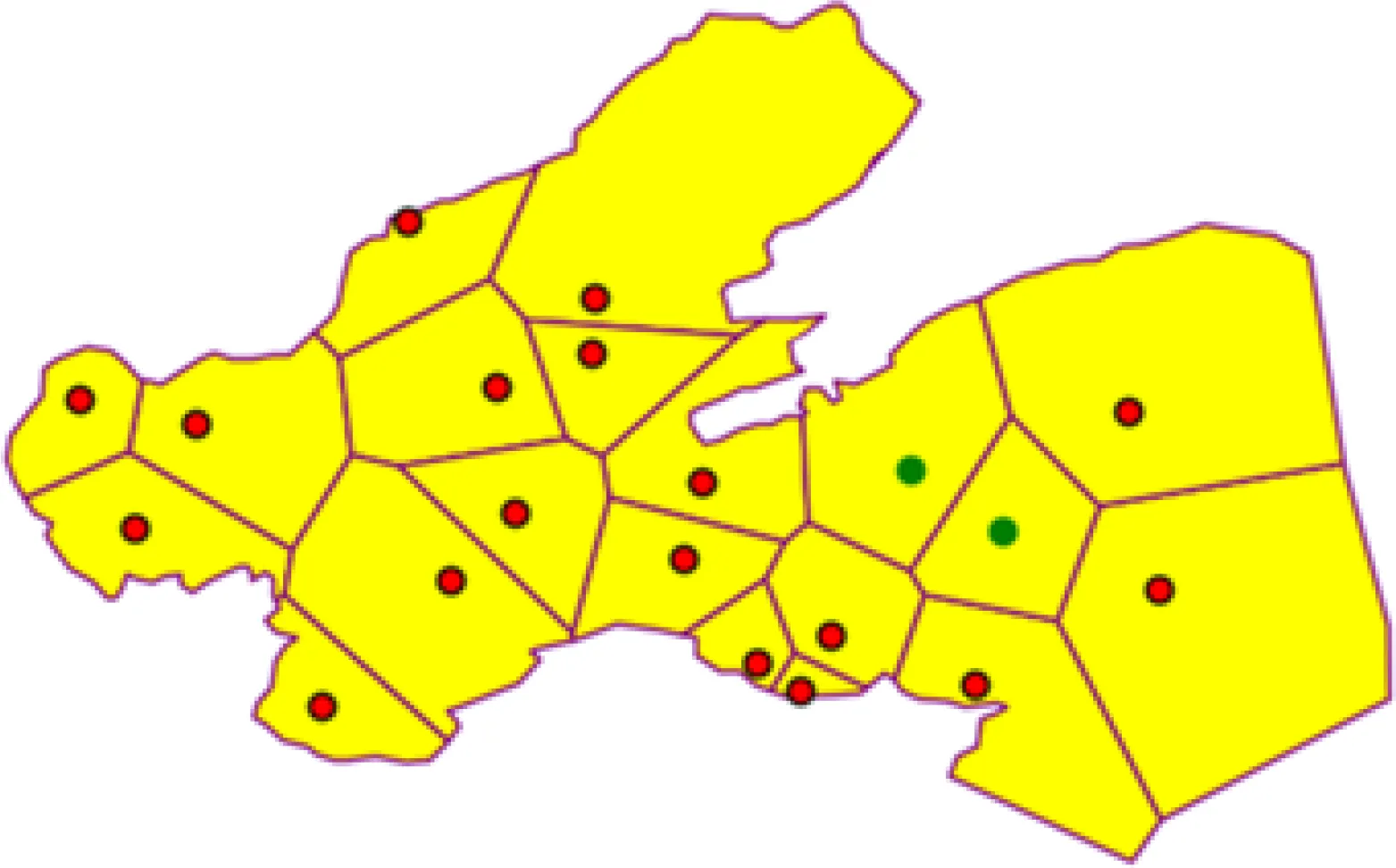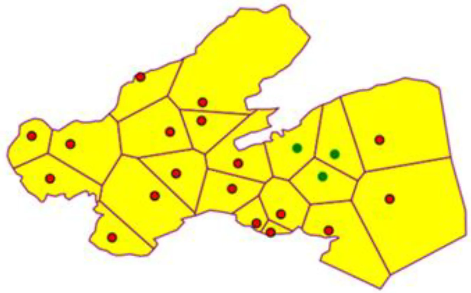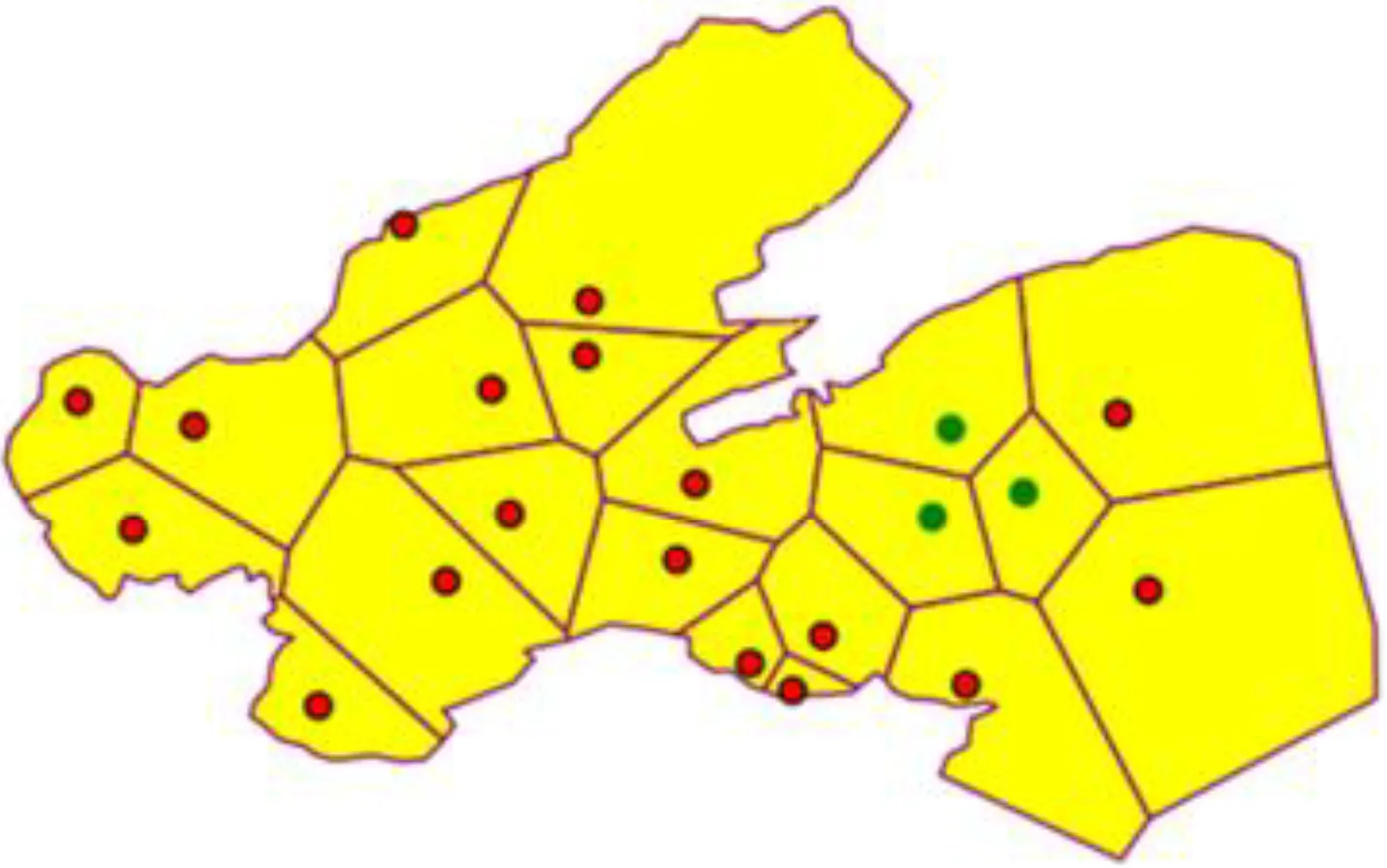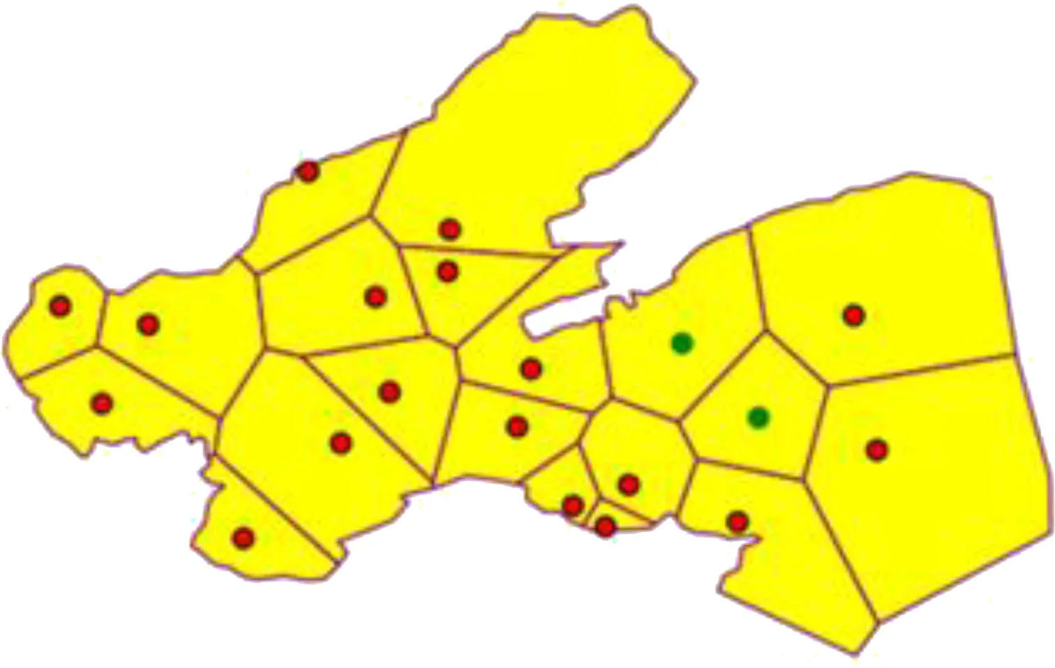 In the MOLMofOBS above, two key elements need to be calculated, namely, EMR and Nb(Pi). In practice, the buoy monitoring stations are distributed discretely on the sea. A set of isolated coordinate points cannot intuitively express the spatial proximity between monitoring stations, nor can it record the adjacent stations of each monitoring station in a quantitative way. Actually, in addition, the boundary of each EMR cannot be delineated effectively. To estimate EMR and Nb(Pi), a spatial neighborhood model is built in the next section.