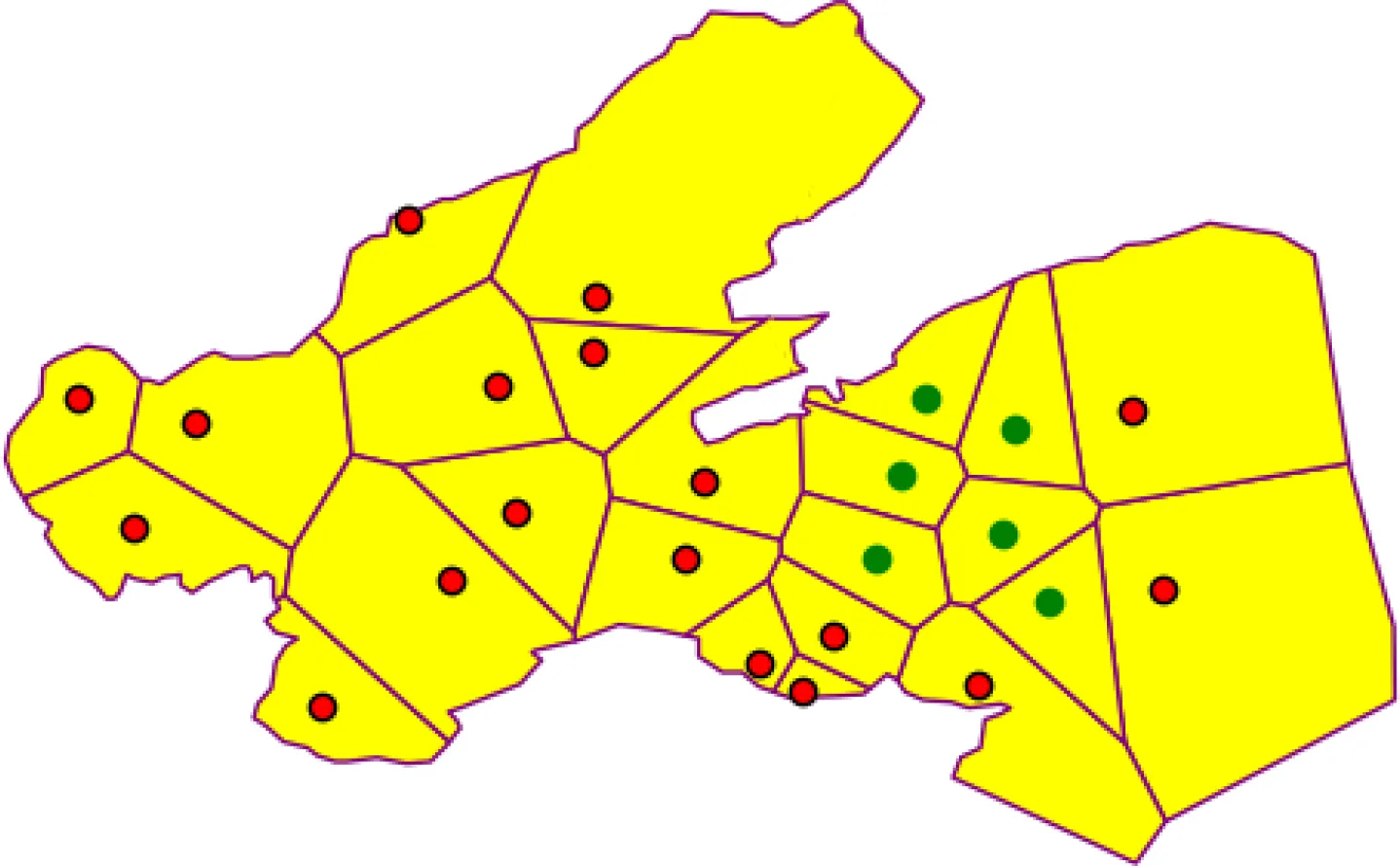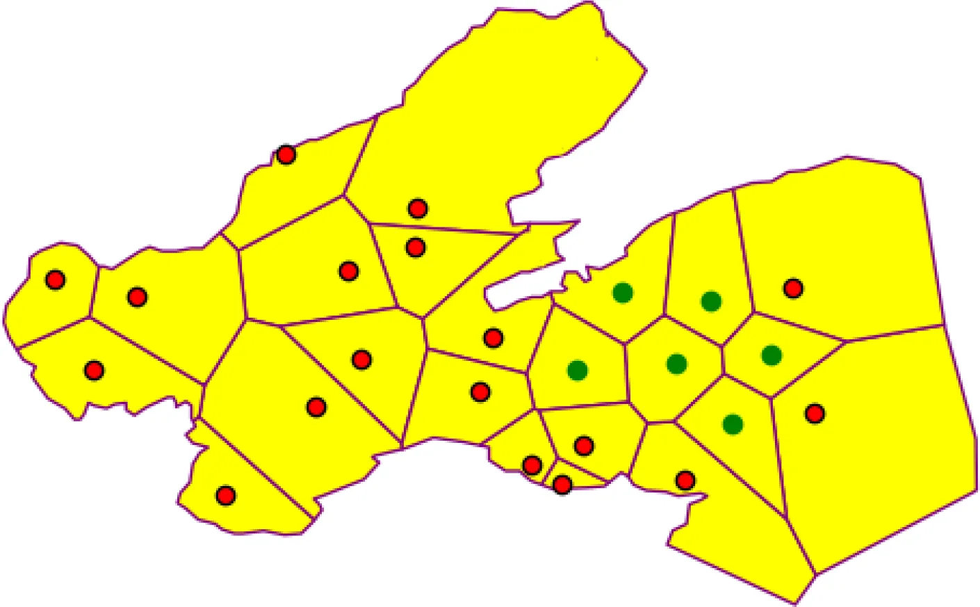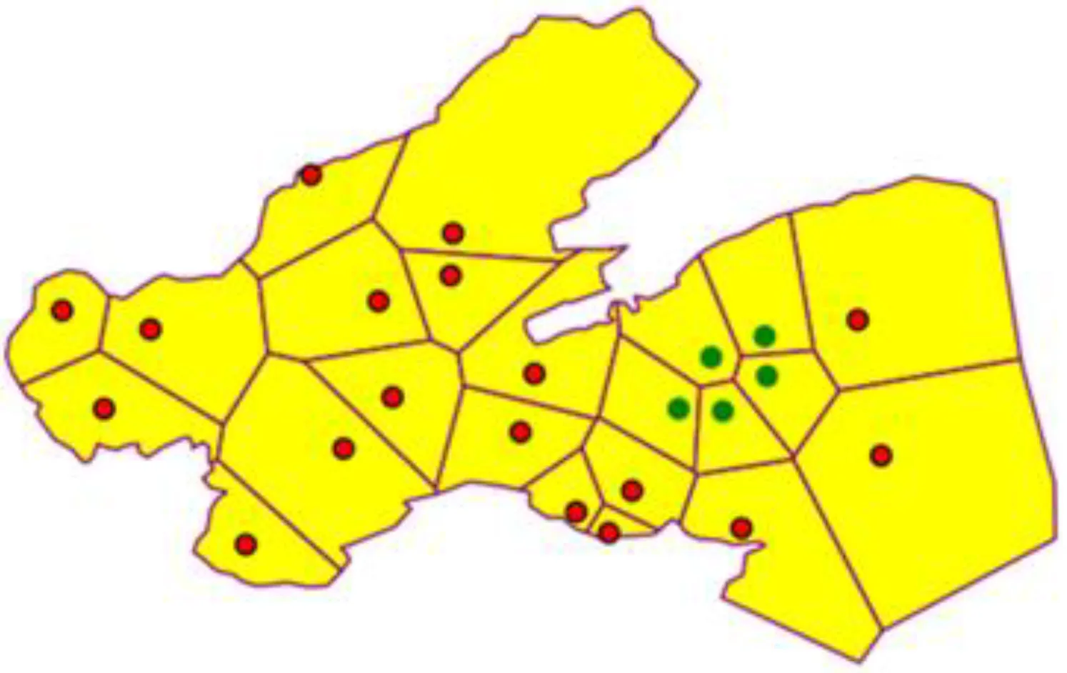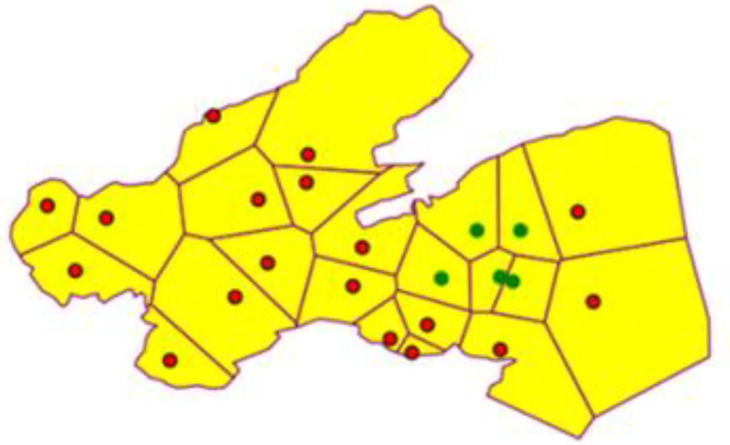 In the MOLMofOBS above, two key elements need to be calculated, namely, EMR and Nb(Pi). In practice, the buoy monitoring stations are distributed discretely on the sea. A set of isolated coordinate points cannot intuitively express the spatial proximity between monitoring stations, nor can it record the adjacent stations of each monitoring station in a quantitative way. Actually, in addition, the boundary of each EMR cannot be delineated effectively. To estimate EMR and Nb(Pi), a spatial neighborhood model is built in the next section.