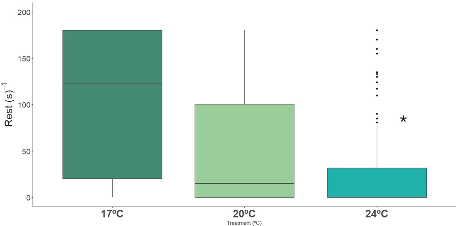 Time spent in stationary behavior (s-1) by long-snouted seahorse exposed to different temperature treatments (17°C, 20°C and 24°C). Bold * represent significant differences from control treatment.