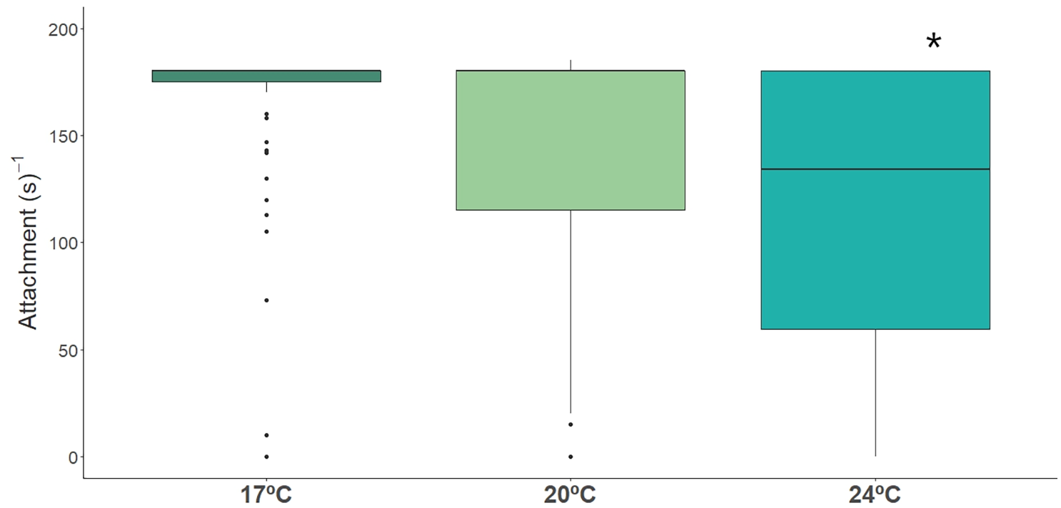 Time spent attached (s-1) by long-snouted seahorse exposed to different temperature treatments (17°C, 20°C and 24°C). Bold * represent significant differences from control treatment.