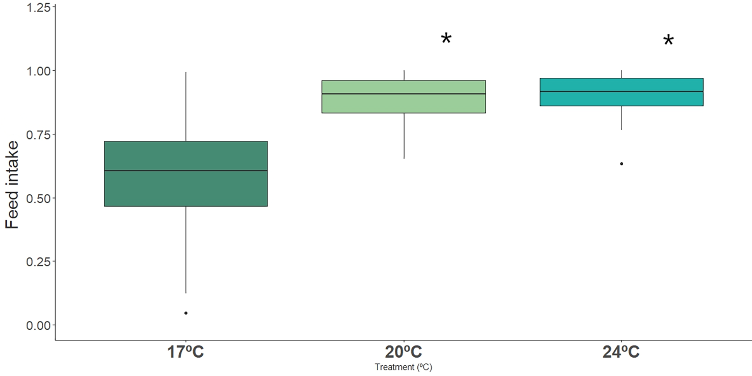 Impact of ocean warming on the feed intake of long-snouted seahorse exposed to different temperature treatments (17°C, 20°C and 24°C). Bold * represent significant differences from control treatment.