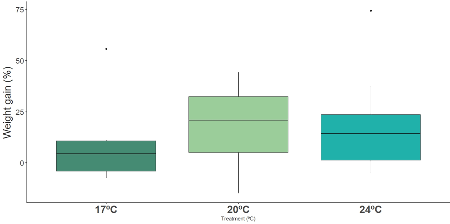 Impact of ocean warming on weight gain (%) of long-snouted seahorse exposed to different temperature treatments (17°C, 20°C and 24°C).