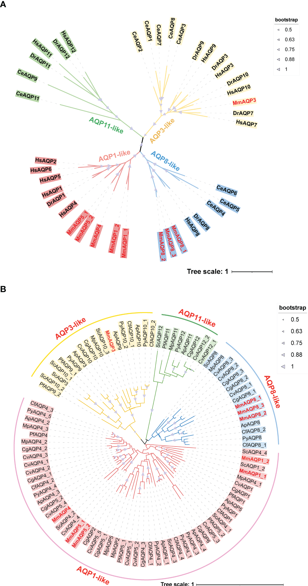 Phylogenetic analysis of MmAQPs and other known AQPs in three model organisms (A), and the AQPs identified in nine bivalves (B). The species names are abbreviated as follows, H. sapiens, Hs; D. rerio, Dr; C. elegans, Ce; C. gigas, Cg; C. virginica, Cv; P. fucata, Pf; A. purpuratus, Ap; C. farreri, Cf; P. yessoensis, Py; M. philippinarum, Mp; and S. constricta, Sc. AQP3-like, AQP1-like, AQP8-like, and AQP11-like subfamily members are marked in yellow, pink, blue, and green, respectively. The MmAQPs are highlighted in red. The bootstrap values greater than 50 are marked with purple triangles.