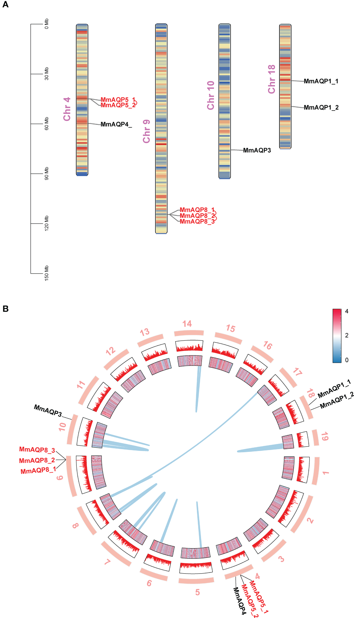 Chromosomal distribution, gene duplication and collinearity of MmAQPs. (A) Chromosome location of MmAQP genes. Tandemly-duplicated MmAQP genes are marked in red. (B) Collinear gene pairs on different chromosomes. The outer circle represents 19 chromosomes in hard clams. The inner circle represents the gene density of each chromosome. Red represents high, and blue represents low. The collinear gene pairs are linked by blue lines.