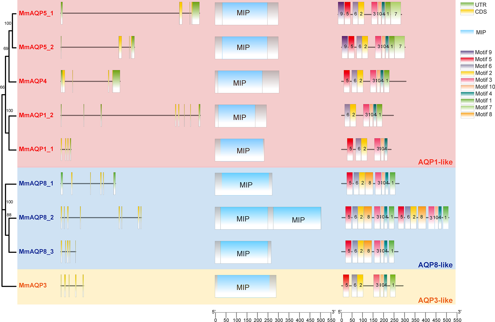 Phylogenetic tree, exon-intron structures, conserved domains and motifs of MmAQPs. On the left side of the diagram, green boxes, black lines, and yellow boxes represent untranslated regions (UTRs), introns, and exons, respectively. In the middle, blue boxes represent the MIP domains. On the right, 10 boxes of different colors represent different motifs. The AQP1-like, AQP8-like, and AQP3-like subfamilies are marked with pink, blue, and yellow, respectively.