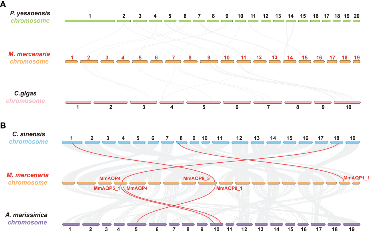 Synteny analysis to detect the orthologs of MmAQPs in the geome of P. yessoensis and C. gigas(A), as well as C. sinensis and A. marissinica(B). Grey lines in the background represent the collinear gene pairs between the two genomes. The orthologous AQP gene pairs are linked by red lines.