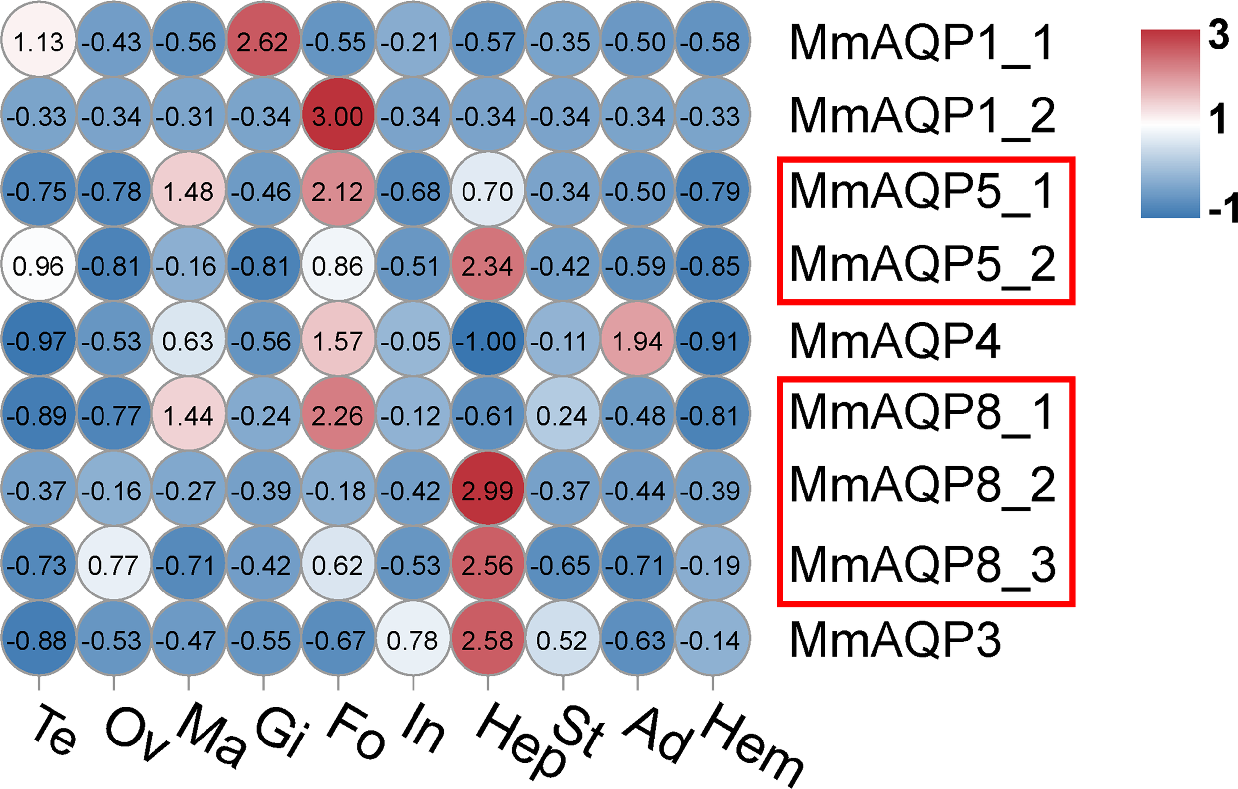 Heatmap analysis of MmAQP genes in different tissues. The name of each tissue is abbreviated as follows: Te, testis; Ov, ovary; Ma, mantle; Gi, gill; Fo, foot; In, intestine; Hep, hepatopancreas; St, stomach; Ad, adductor muscle; and Hem, hemolymph. Red indicates a high level of gene expression, and blue indicates low expression. The tandemly-duplicated genes are marked with red rectangles.