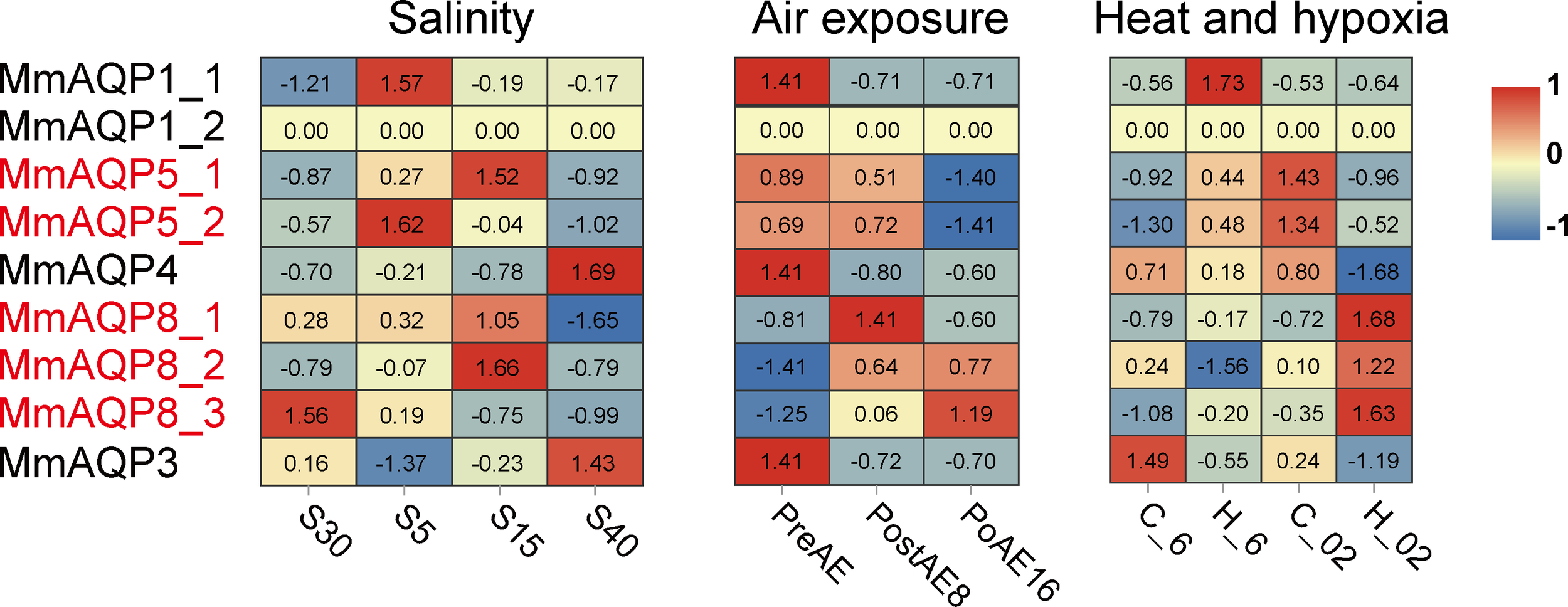 Heatmap analysis of MmAQP genes in response to salinity, air exposure, and heat and hypoxia stress. Red indicates a high level of gene expression, and blue indicates low expression. The tandemly-duplicated genes are marked in red.
