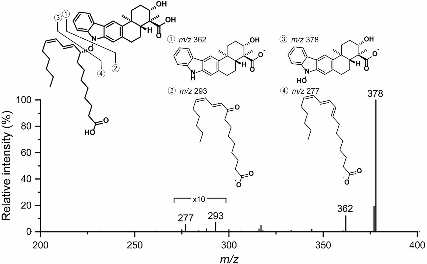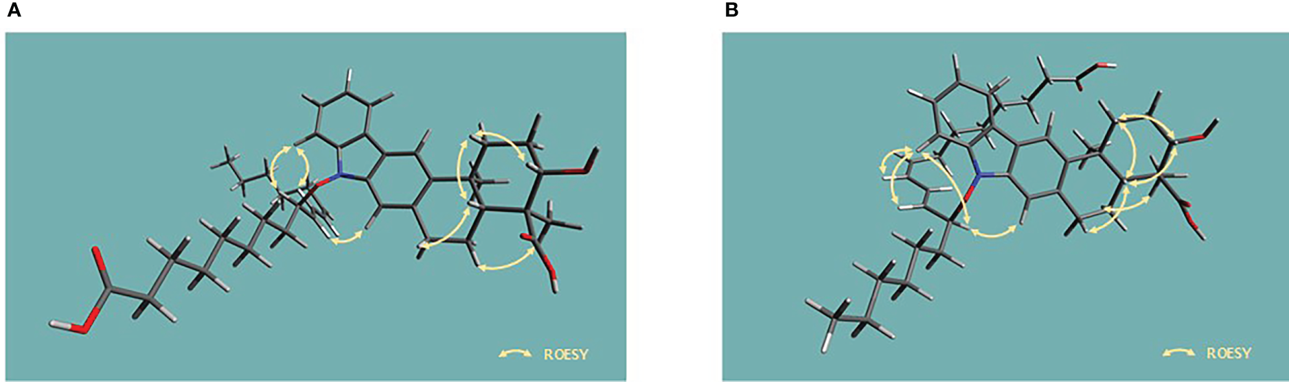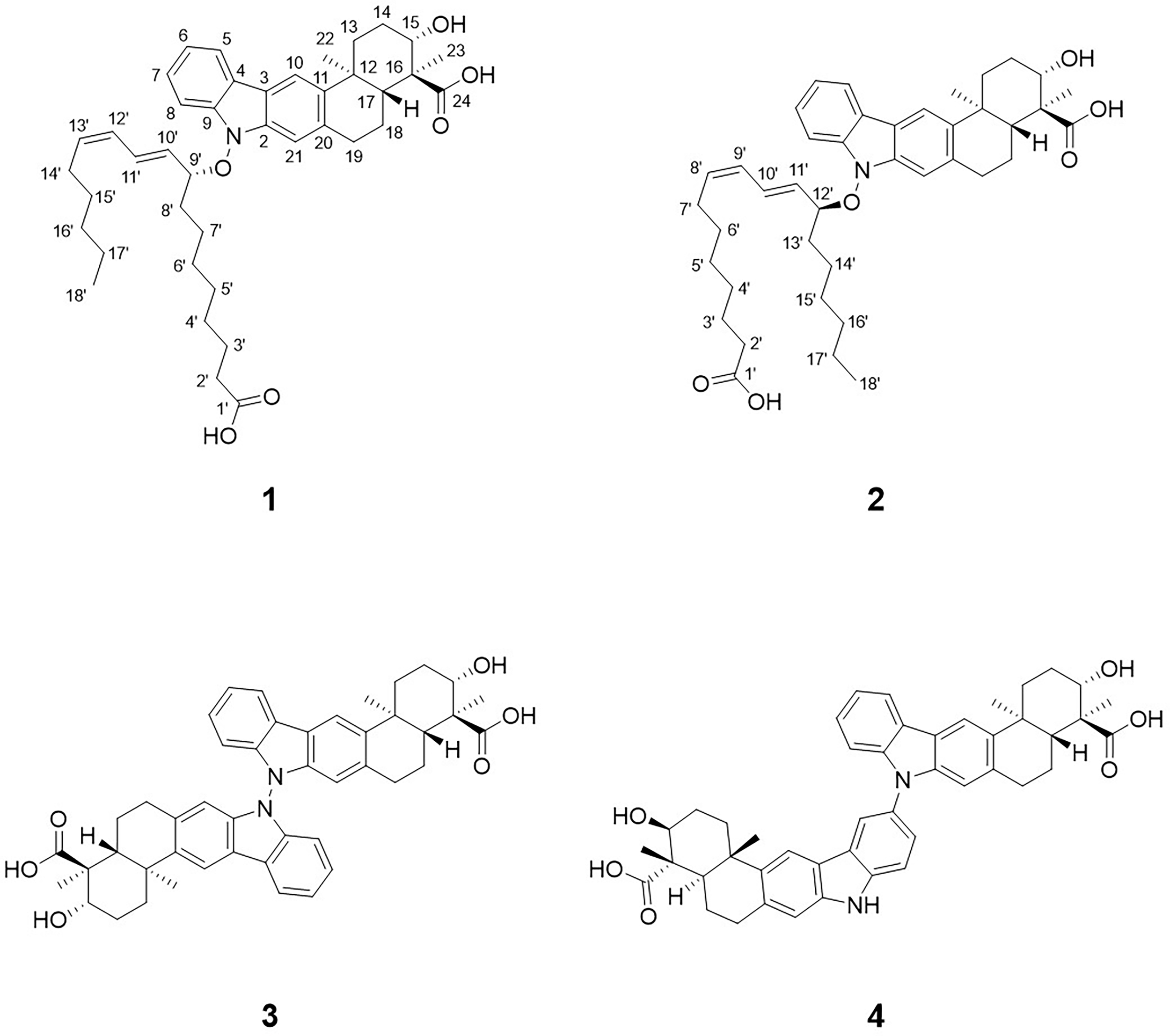 The configurations of the conjugated double bond were determined to be 10’E, and 12’Z based on the 15 Hz 1H–1H coupling constant between H-10’ (δH 5.77) and H-11’ (δH 6.13) and the 10 Hz coupling constant between H-12’ (δH 5.82) and H-13’ (δH 5.31). This geometry was also supported by H-10’ (δH 5.77)/H-12’, H-12’ (δH 5.82)/H-13’ (δH 5.31), H-13’/H-14’ (δH 1.82), and H-11’ (δH 6.13)/H-8’b (δH 1.80) ROESY correlations. Subsequently, the 9-hydroxyoctadeca-10E-12Z-dienoic acid moiety was connected to the carbazole nitrogen atom of the indolosesquiterpenoid core through a N–O bond based on the previously determined molecular formula and chemical shifts of the C-9’ (δC 89.5) and H-9’ (δH 4.83) atoms.