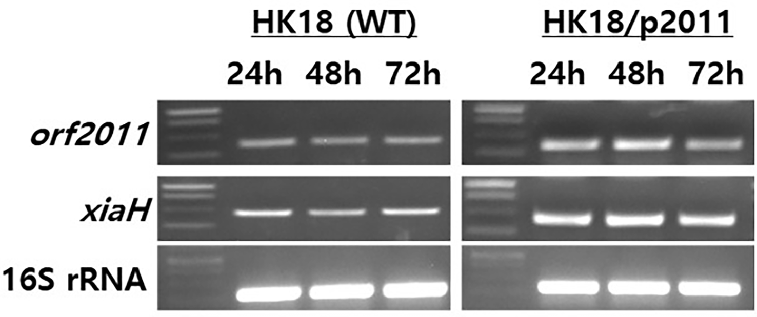 To confirm the transcriptional changes in orf2011 and xiaH, the total RNA was isolated from the wild-type and HK18/p2011 strains, respectively. The harvested cells were suspended in TRIzol reagent (1 mL; Invitrogen, Carlsbad, CA, USA) and incubated at room temperature for 5 min. The mixture was vortexed with chloroform (200 μL) and subjected to centrifugation at 13,000 × g for 15 min. The supernatant was then collected in a new tube and mixed with one volume of 70% ethanol. The mixture was transferred to an RNeasy Mini spin column (Qiagen, Hilden, Germany) and centrifuged at 8,000 × g for 15 s at room temperature. Subsequently, the spin column was washed with RPE washing buffer (Qiagen, Hilden, Germany), and the resulting total RNA was dissolved in RNase-free water (50 μL). The nucleic acid preparations were treated with DNase I (New England Biolabs, Ipswich, MA, USA), as recommended by the manufacturer. The RT-PCR conditions employed for analysis were as follows: cDNA synthesis, 50°C for 30 min, 95°C for 15 min, followed by 33 cycles of 94°C for 1 min, 55°C for 1 min, and 72°C for 45 s. The cycle number was optimized for each gene to obtain sufficient visibility of the RT-PCR bands, to ensure that amplification was within the linear range, and to obtain semi-quantitative results. Primers (Tm = 50–60°C; 20mer) were designed using the Primer3 software (Rozen and Skaletsky, 2000) (Table S11). With each set of primers, negative controls were carried out using Taq DNA polymerase (New England Biolabs, Ipswich, MA, USA) in the absence of the RT reaction to confirm that the amplified products were not derived from chromosomal DNA. 16S rRNA was used as the positive control due to its known expression in this system. The RT-PCR experiments were performed in triplicate using RNA samples obtained from three independent cultures.