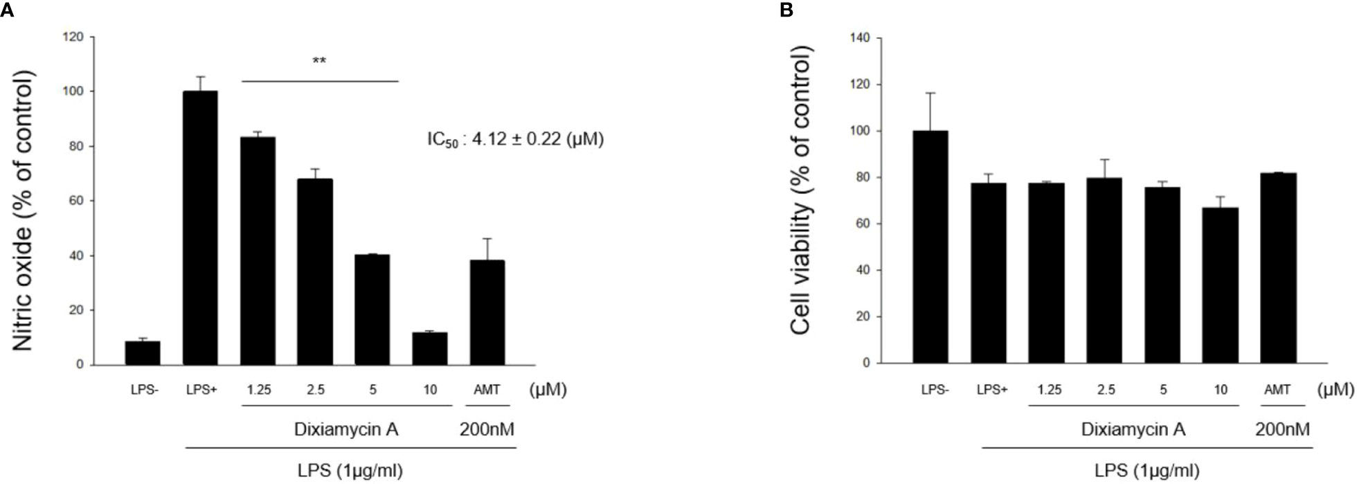 The mouse macrophage RAW 264.7 cell line was obtained from the American Type Culture Collection (ATCC, Rockville, MD, USA). The cells were cultured in Dulbecco’s Modified Eagle’s medium (DMEM) supplemented with 10% heat-inactivated fetal bovine serum (FBS) and 1% antibiotics-antimycotics (0.25 mg/mL amphotericin B), and were incubated in a 5% CO2 atmosphere at 37°C. The amount of NO produced by the RAW 264.7 cells in the culture medium was determined using the Griess reagent (0.1% N-(1-naphthyl)ethylenediamine dihydrochloride and 1% sulfanilamide in 5% phosphoric acid). The RAW 264.7 cells were seeded in 24-well plates at a density of 2 × 105 cells/mL and incubated at 37°C in a 5% CO2 atmosphere for 24 h. After this time, the cells were washed with phosphate-buffered saline (PBS), replaced with fresh medium containing 1% FBS, and pre-treated with either the vehicle or with the samples prepared at various concentrations (i.e., 1.25, 2.5, 5, 10, and 20 μM). Following incubation for 1 h at 37°C, the cells were stimulated with lipopolysaccharide (LPS; 1 μg/mL) for 20 h. The control group was subjected to the same conditions but in the absence of LPS. After transferring an aliquot (100 μL) of the supernatant from each well into a 96-well plate, the Griess reagent (180 μL) was added. The absorbance of each plate was measured at 540 nm using a microplate reader. The NO concentration was calculated using a sodium nitrite standard. The cell viability was determined using the colorimetric MTT assay. More specifically, following the NO assessment, the MTT solution was added to each well to give a final concentration of 500 μg/mL. After incubation at 37°C for 4 h, the medium was discarded, and the remaining formazan blue salt was dissolved in dimethyl sulfoxide (1 mL, DMSO). An aliquot (100 μL) of each supernatant was then transferred from each well to a 96-well plate, and the absorbance was measured at 570 nm using a microplate reader. The percentage of cell survival (%) was calculated relative to the LPS-treated group.
