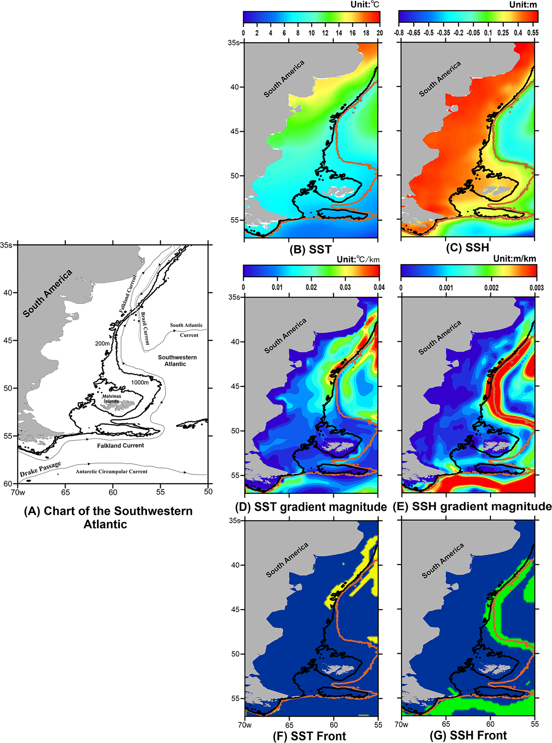 The Southwestern Atlantic (SA) mainly refers to the area of the Atlantic between 35°S-60°S and 50°W-70°W, that connects to the Drake Passage. Topographically, the area consists of the South American continental shelf in the northwest and the Argentine basin in the southeast. Due to its location between subtropical waters and the cold waters in the Southern Ocean, the SA is rich in ocean currents and associated hydrological phenomena, including frontal systems. As shown in Figure 1A, the SA mainly contains three major ocean currents, the Brazil Current, the Falkland Current and the Antarctic Circumpolar Current (ACC). ACC is the strongest cold current in the South Hemisphere. As a tributary of the ACC at Cape Horn, the Falkland Current flows northward along the 1000m isobath and invades into the shelf waters of South American (within the 200m isobath) at about 45°S (Piola et al., 2013). Under the influence of the Brazil Current (a strong warm current), the shelf water on the west side is warmer than the Falkland Current (a strong cold current) on the east side. Since the ocean front refers to the boundary between different water masses in the ocean, the Falklands Current enters the waters of the South American continental shelf, resulting in the meeting of two water masses with completely different temperature and dynamic characteristics, generating the Southwestern Atlantic Front (SAF) (Wang et al., 2021). As an important part of the Southern Ocean Front (Chapman et al., 2020), the SAF has great impacts on the ecological environment, fishery production and material transport in the SA (Lopes et al., 2016). Therefore, it is of great significance to detect the SAF accurately.