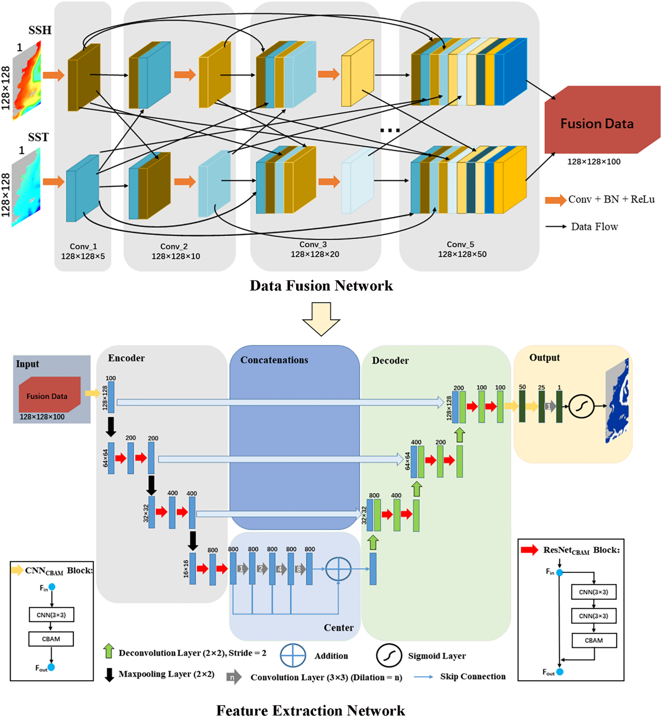 In this study, the FEN is used to accurately detect the SAF based on the output of the DFN. To improve the detection accuracy, the convolutional block attention module (CBAM) (Woo et al., 2018) and dilated convolution layers (DCLs) are integrated into the FEN. FEN uses an encoder-decoder structure. The architecture of FEN includes six parts: input, encoder, center, decoder, concatenations and output. The goal of the encoder is to gradually extract pixels with large gradients from the fusion data through various convolutional layers, to capture the SAF features at different representation levels. The encoder contains one CNNCBAM block, six ResNetCBAM blocks, and three Max pooling layers. A CNNCBAM block is one CNN layer stacking with the CBAM, and a ResNetCBAM block is a ResNet unit integrated with the CBAM. The legend on the right in Figure 2 shows that a ResNet unit contains two CNN layers, stacking the CBAM after the second CNN layer. Adding the attention mechanism to the FEN can effectively capture the thermal and dynamic dependencies of the SAF at different scales. CBAM is divided into two modules: channel attention module and spatial attention module. These two modules can generate the feature map’s weight matrix in two dimensions. Then the weight matrices are multiplied by the input feature map for adaptive feature refinement so that the network is more targeted to extract features. The center part consists of several DCLs with skip connections. Considering the SAF’s narrowness, connectivity, and complexity, it is important to increase the receptive field of feature points in the center part and keep detailed information. DCLs are undoubtedly the best option. The decoder includes four stages, and between each stage, the scale of the feature map is restored by upsampling until the output feature map is the same size as the input data. Six ResNetCBAM blocks are integrated into the decoder to recover the SAF’s details accurately. The concatenation fuses the encoder and decoder at the same level, effectively preventing feature loss. The output consists of two CNNCBAM blocks, a 3×3 convolutional layer, and a sigmoid layer, finally outputs a value between [0,1]. If it is greater than 0.5, the pixel is the SAF; Otherwise, it is a non-front.