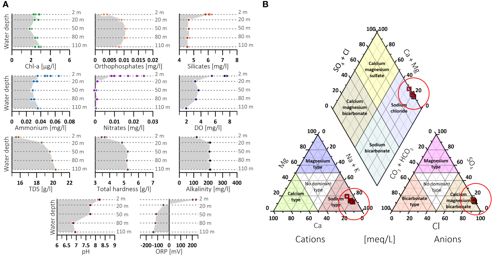 Figure 5 Hydrochemical data from water samples. (A) Concentrations of chlorophyll-a (Chl-a), orthophosphates, silicates, ammonium, nitrates, dissolved oxygen, total dissolved solids (TDS), total hardness, and alkalinity at different water depths (2, 20, 50, 80, and 110 m). (B) Piper diagram for classifying the ionic composition of collected water samples into hydrochemical facies and the dominant presence of anions and cations (see also Table 1).