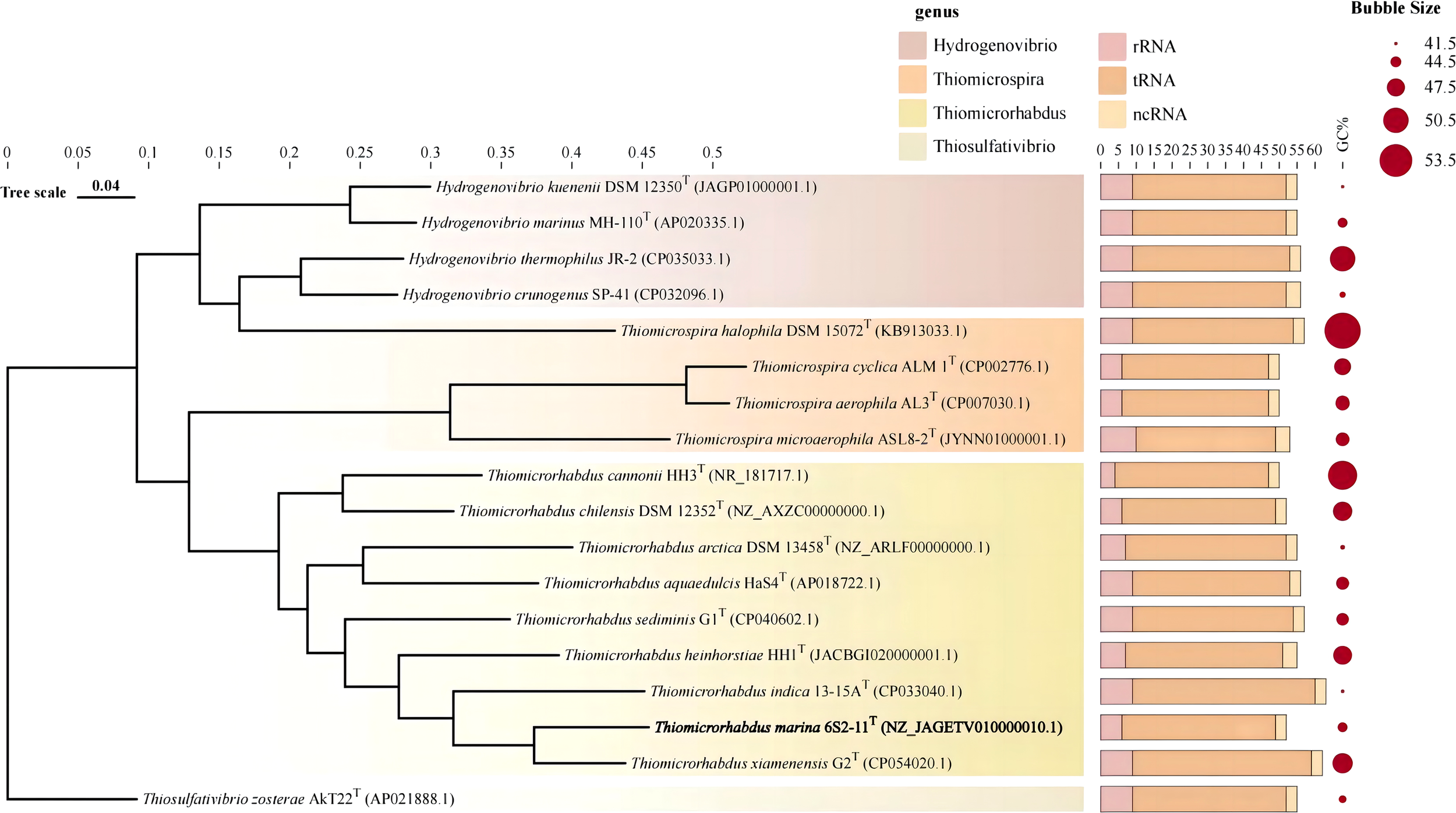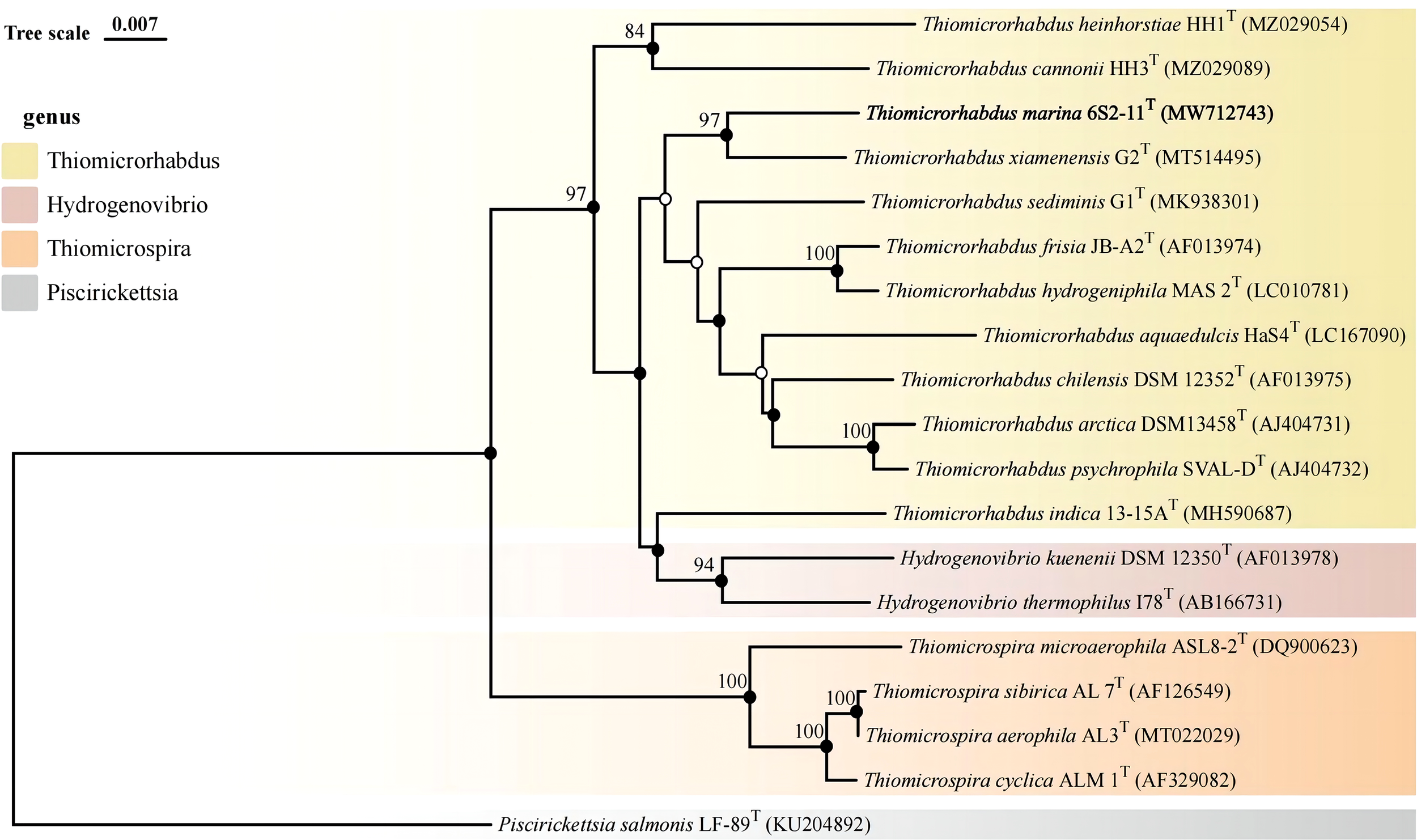 The strain 6S2-11T was isolated from tidal zone sediment of the coast of Weihai, China (36°58′37″ N, 122°2′37″ E). After sample enrichment, 100 μL of samples with dilution gradients of 10-3 and 10-4 were spread on SOB medium (Peptone 5 g/L, yeast powder 1 g/L, sodium pyruvate 0.3 g/L, NH4Cl 0.26 g/L, Na2S2O3 4.96 g/L) and incubated at 30°C. The isolated strain 6S2-11T was cultured on SOB medium at 30°C, stored in a sterile mixture of 1% (w/v) saline and 15% glycerol at -80°C. The type strain Thiomicrorhabdus xiamenensis G2T and. Thiomicrorhabdus sediminis G1T were used as reference strains which are also cultivated on SOB medium at 30°C.
