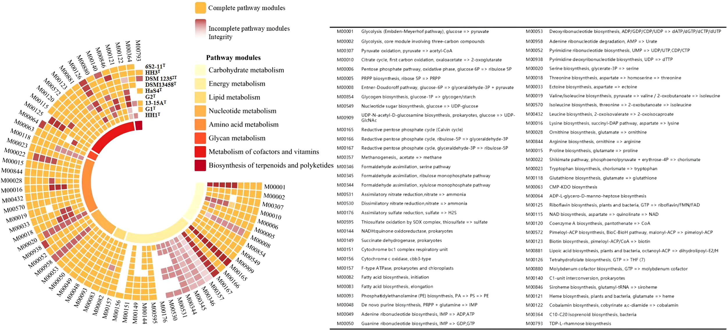 The metabolic modules integrity of Thiomicrorhabdus strains. The orange color blocks represent intact metabolic modules, and the red-brown color blocks represent incomplete metabolic modules. The integrity of incomplete metabolic modules is indicated by color shades. The lowest integrity is 0 for white.