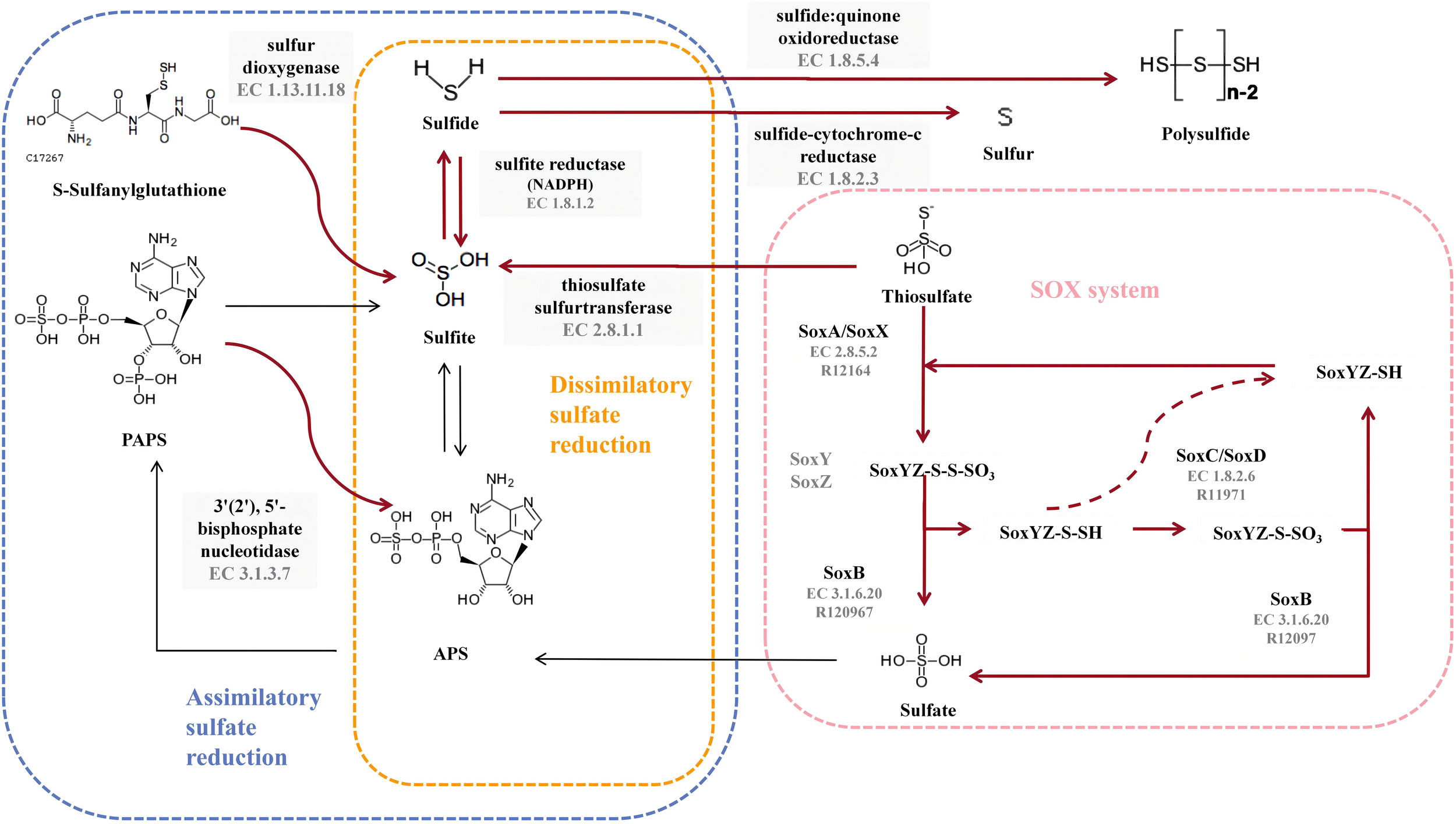 Diagram of the sulfur metabolic pathway. The pink blocks indicate SOX pathway-related enzymes, and the gray blocks indicate enzymes owned by strain 6S2-11T that are not related to SOX but are related to sulfur metabolism. The red bolded arrows indicate pathways available to strain 6S2-11T.