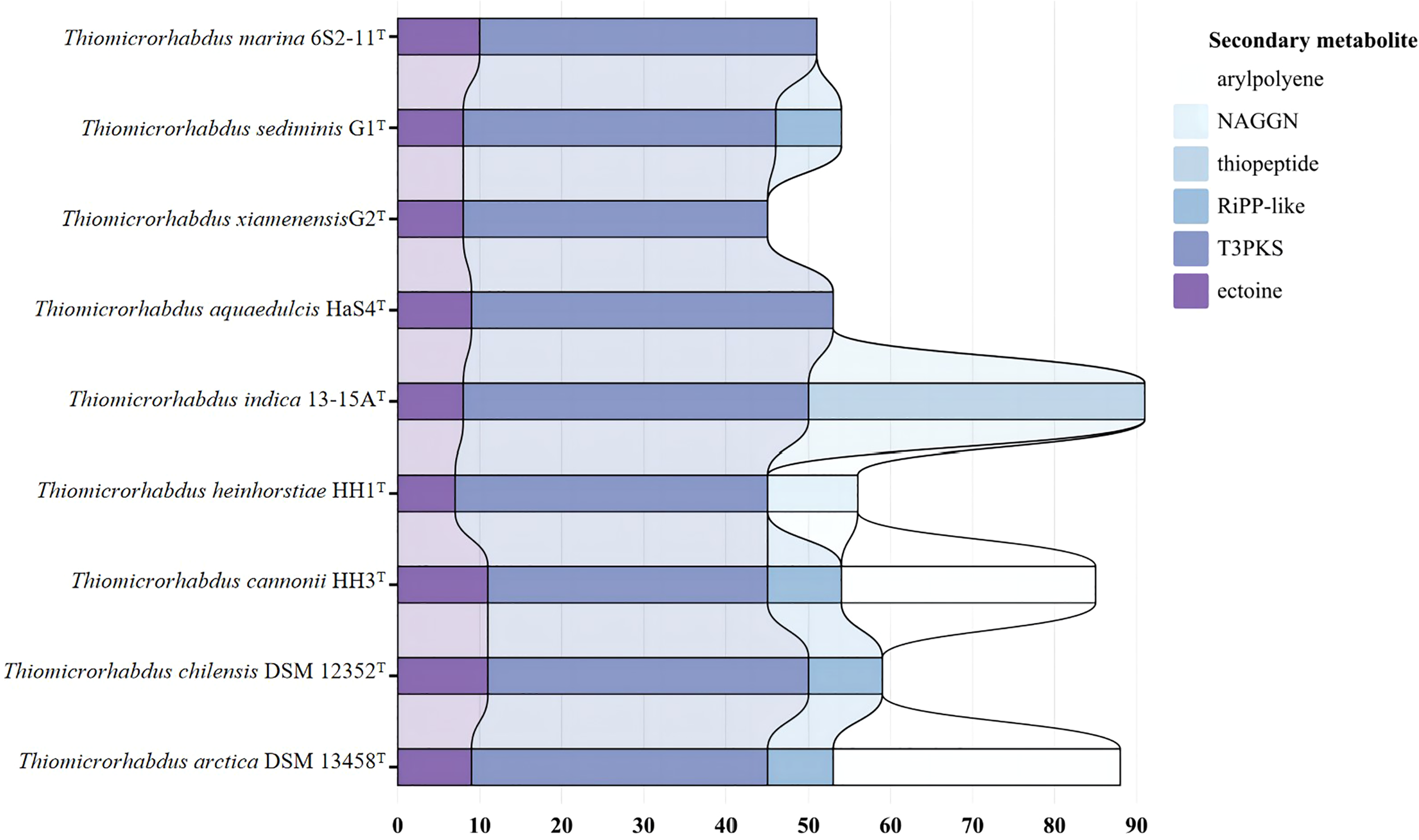 Nine strains of the genus Thiomicrorhabdus were annotated using the antiSMASH database to predict secondary metabolites. The results obtained revealed that all strains produce ectoine and TypeIII polyketides synthase (T3PKS). In addition, G1T, 13-15AT, DSM 12352T, DSM 13458T and HH3T produce RiPP-like (other unspecified ribosomally synthesised and post-translationally modified peptide product); DSM 13458T and HH3T produce arylpolyene; HH1T produce N-acetylglutaminylglutamine amide (NAGGN) (Figure 5).