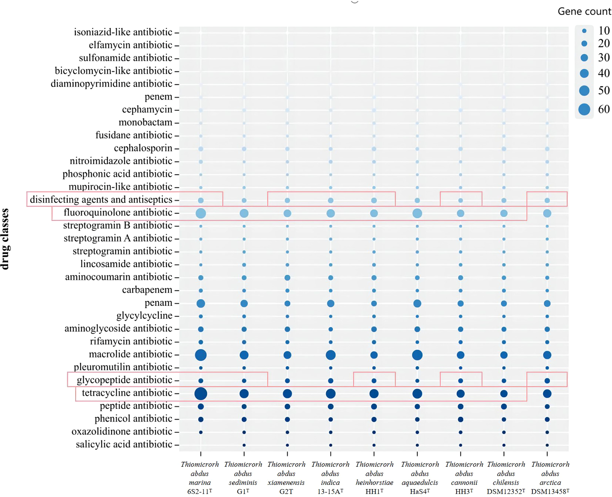 The gene count of different antibiotics resistance genes annotated for Thiomicrorhabdus strains. Red highlighting indicates that it has genes that are annotated by a rigorous algorithm.