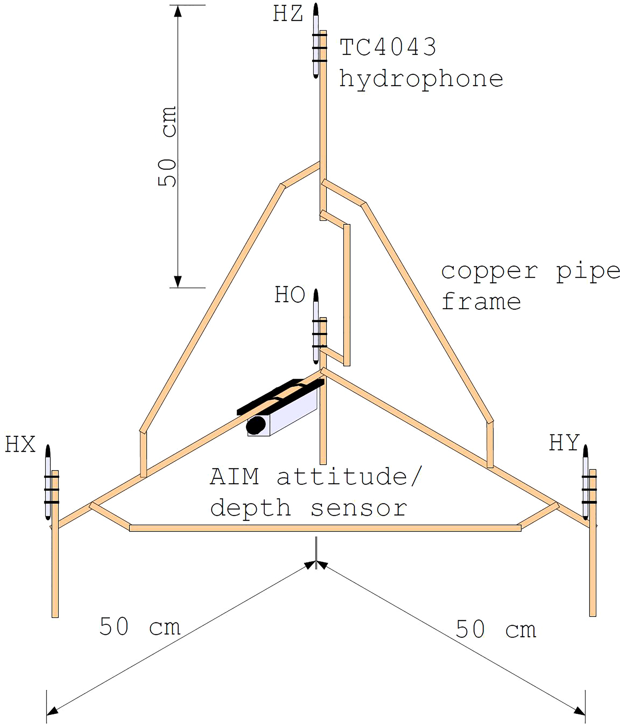 Schematic diagram of the pressure gradient sensor shown in isometric projection. Four Reson TC4043 hydrophones are located at the positions indicated (origin) (-axis) (-axis) and (-axis). The JASCO AIM attitude/depth sensor is oriented in the -direction. The axial hydrophones and are all located 50 cm from the origin hydrophone .