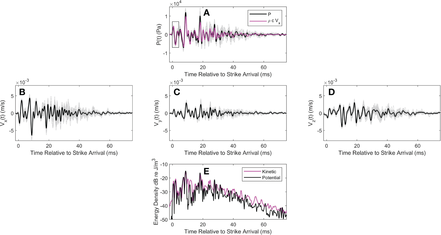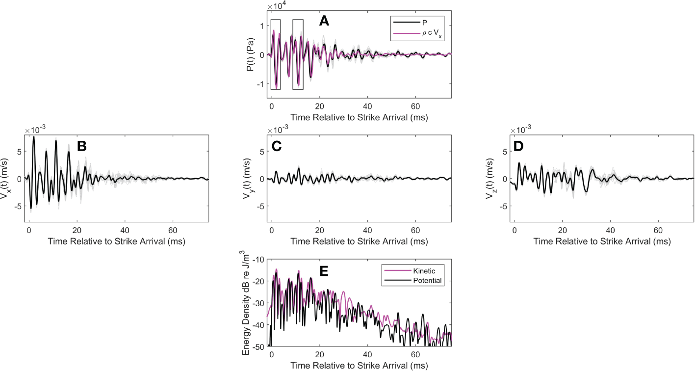 (A) coherent average of pressure over strikes (black line) and individual strike time series (gray lines). Measurements are from pile T8 at range 10 m. Magenta line shows coherent average of the -component of acoustic velocity scaled by . For this display the sign of is flipped. Data shown within the two boxes (duration 4-ms) are used in subsequent analysis. Time is relative to the pile strike arrival. (B) Coherent average of along with individual strike time series (gray lines); (C, D) provide similar display of and , respectively, together with the individual strike time series (gray lines). (E) Time varying potential (black line) and kinetic (magenta line) energy density averaged over strikes.