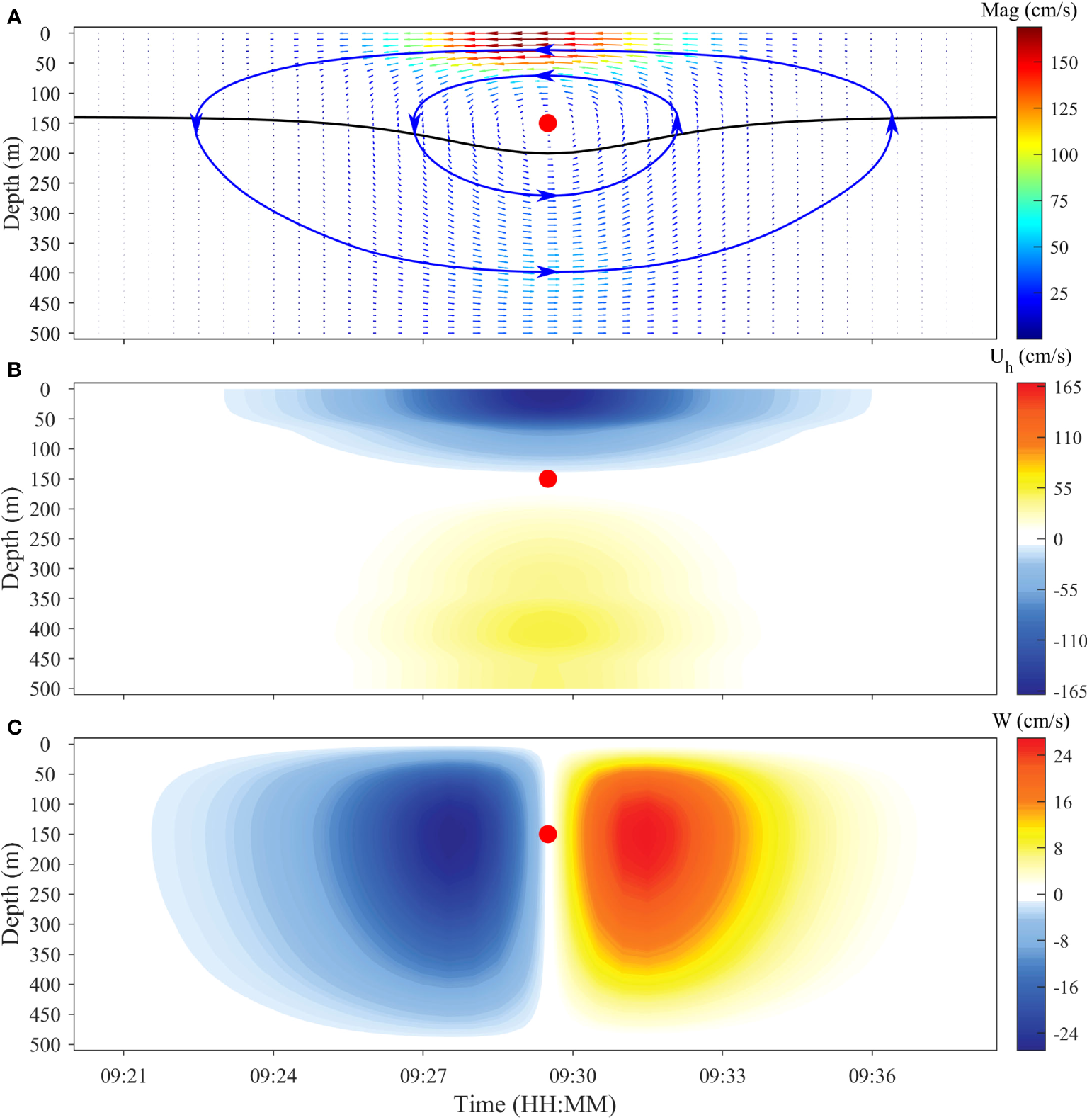 Vertical profiles of (A) velocity vectors, (B) horizontal velocity, and (C) vertical velocity field of mode-1 ISW simulated by the KdV theory. The black and blue curves in (A) represent the waveform of ISW with maximum amplitude and streamlines, respectively. The solid red dots in each subgraph represent the center of the ISW flow.