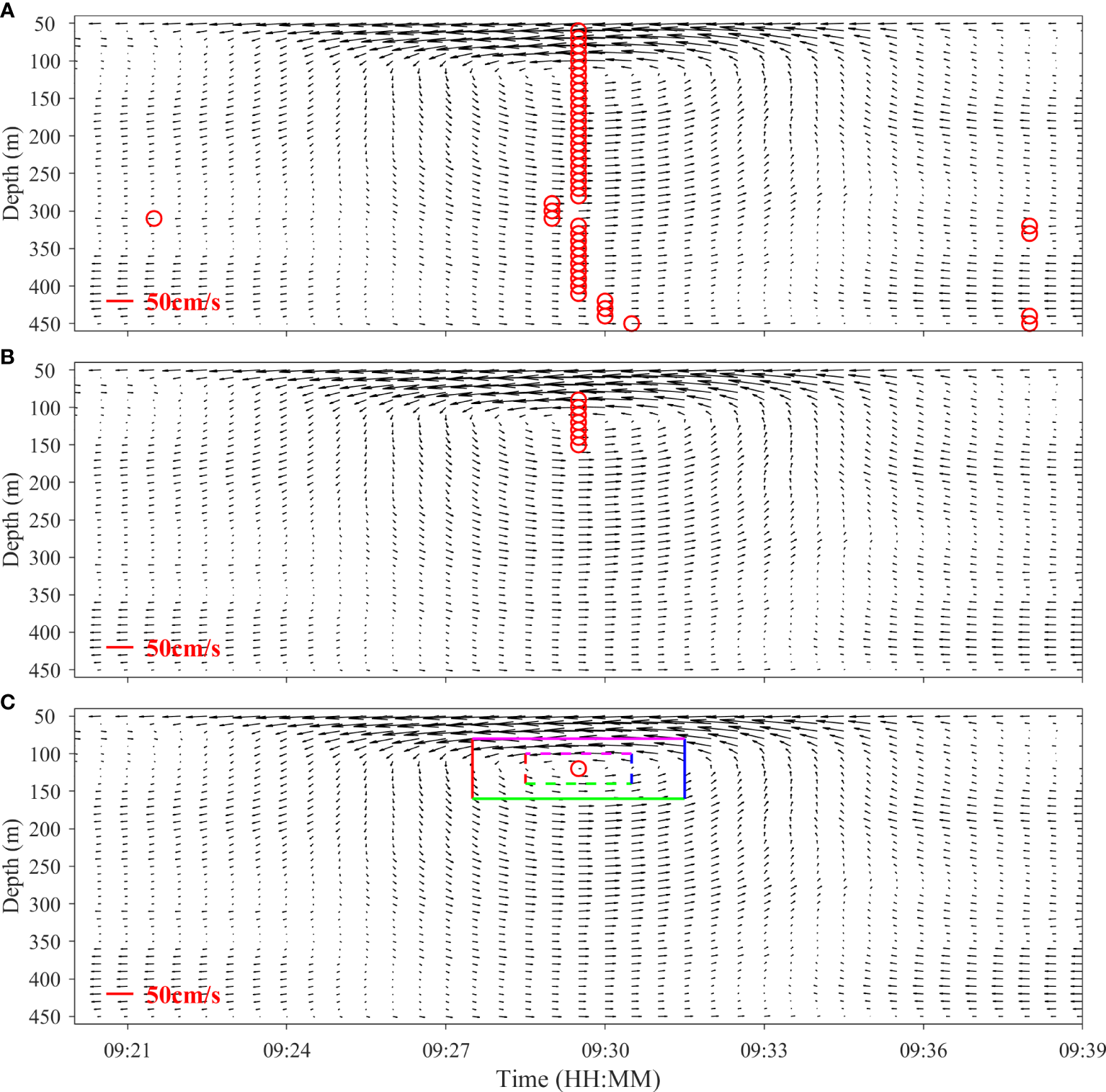 The (A) first, (B) second, and (C) third constraints applied to the measured ISW current field observed at mooring B on 4 August 2018. The red circles in each subgraph represent the grid points that satisfy the constraints. The length of the red line in the lower left corner of each subgraph indicates the velocity of 50 cm/s. The colored solid and dotted rectangles in (C) represent the search scope, and the velocity vectors on the edges need to be further screened by applying the fourth constraint ().