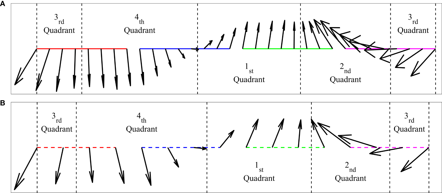 Velocity vector arrows on the colored (A) solid and (B) dotted boxes in Figure 7C arranged counterclockwise from the upper left corner of the rectangle. The vector arrows between two adjacent black dashed lines are located in the same quadrant.